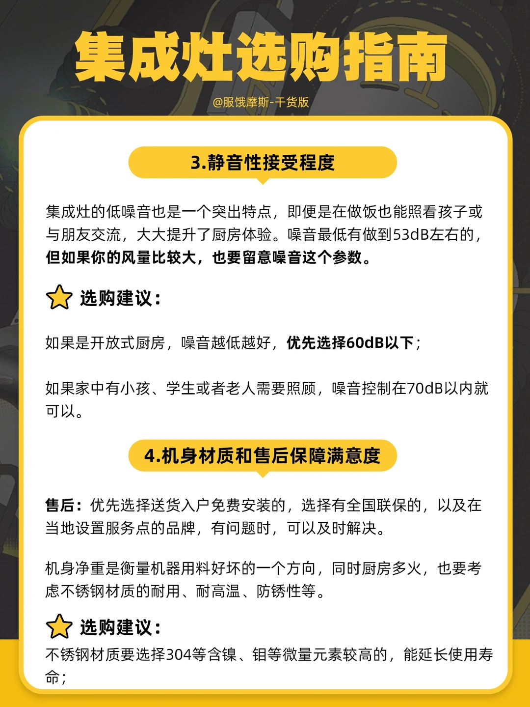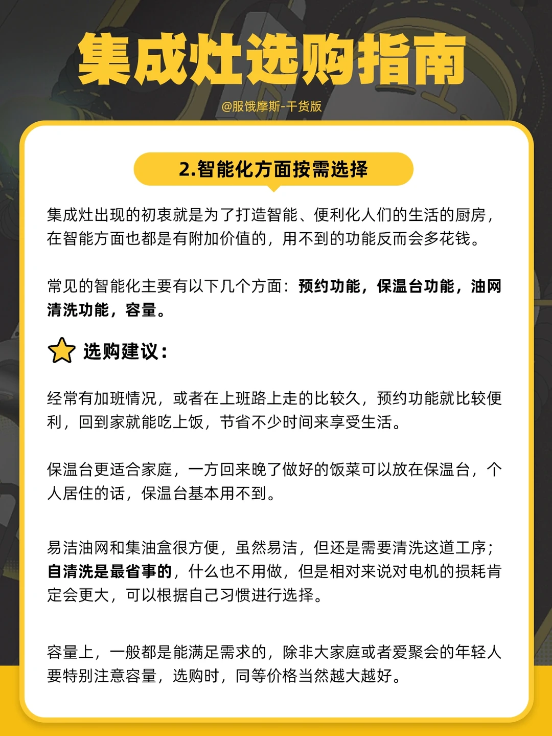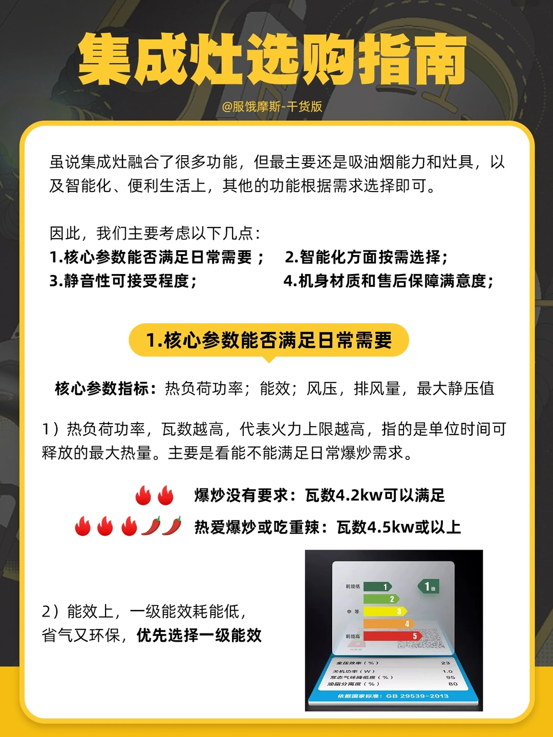现在厨房设施越来越多样化,集成灶也已经走入很多人的家里。 🕹现在的集成灶内容丰富,功能贼多。品牌和样式也特别多。最近很多粉丝问我应该怎样挑选集成灶。 ❗️虽说集成灶融合了很多功能,但最主要还是吸油烟能力和灶具,以及智能化、便利生活上,其他的功能根据需求选择即可。 ♥️因此,我们主要考虑以下几点: ⭐️1.核心参数能否满足日常需要 ; ⭐️ 2.智能化方面按需选择; ⭐️3.静音性可接受程度; ⭐️4.机身材质和售后保障满意度; -