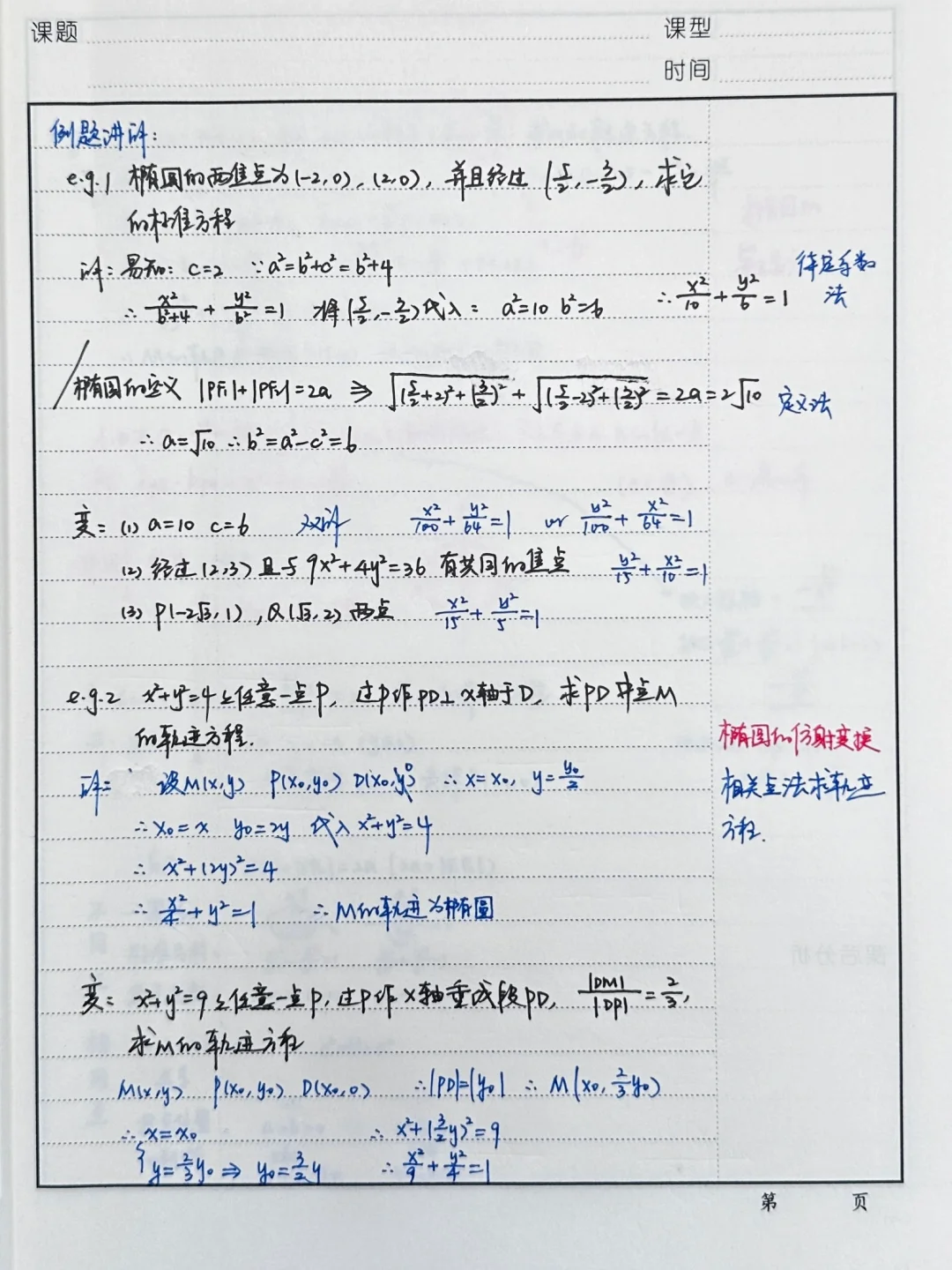 再不开始真的来不及,一个月讲这章内容,太充实了,高中最难的内容(我觉得),特别多的结论需要去推导,后续挑战很大,准备慢慢给学生渗透。 今天只讲了教案的一半,主要讲椭圆定义和轨迹方程,怎么求椭圆方程~