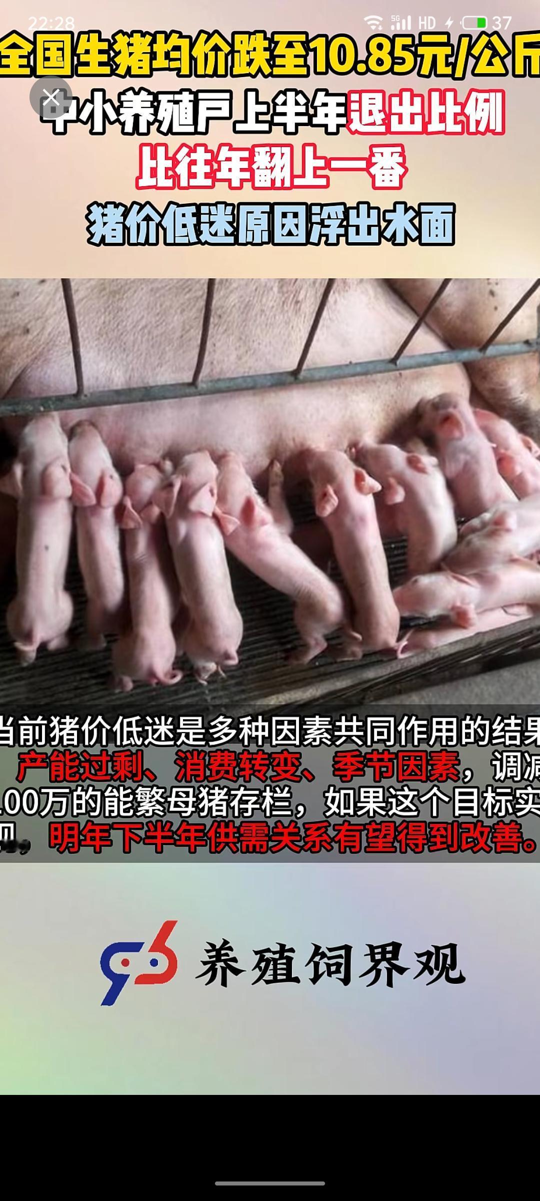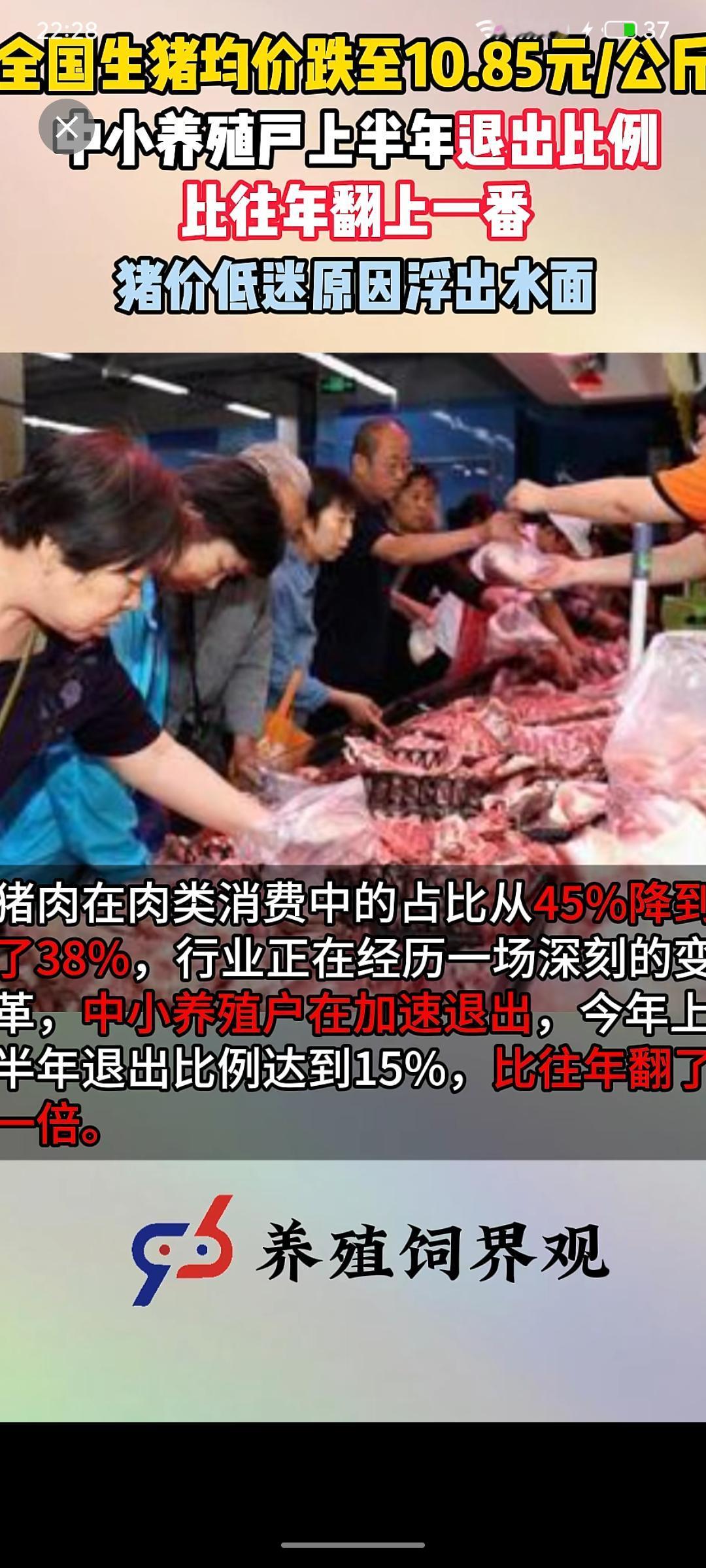 当前生猪价格跌至10.85元/公斤,同比暴跌超40%,部分地区甚至跌破5元/斤。同时,猪肉消费占比显著下降,行业正经历深刻变革。中小养殖户加速退出,上半年退出比例达15%,较往年翻番。这反映了产能过剩、消费结构转变等多重压力下的行业深度调整与洗牌。