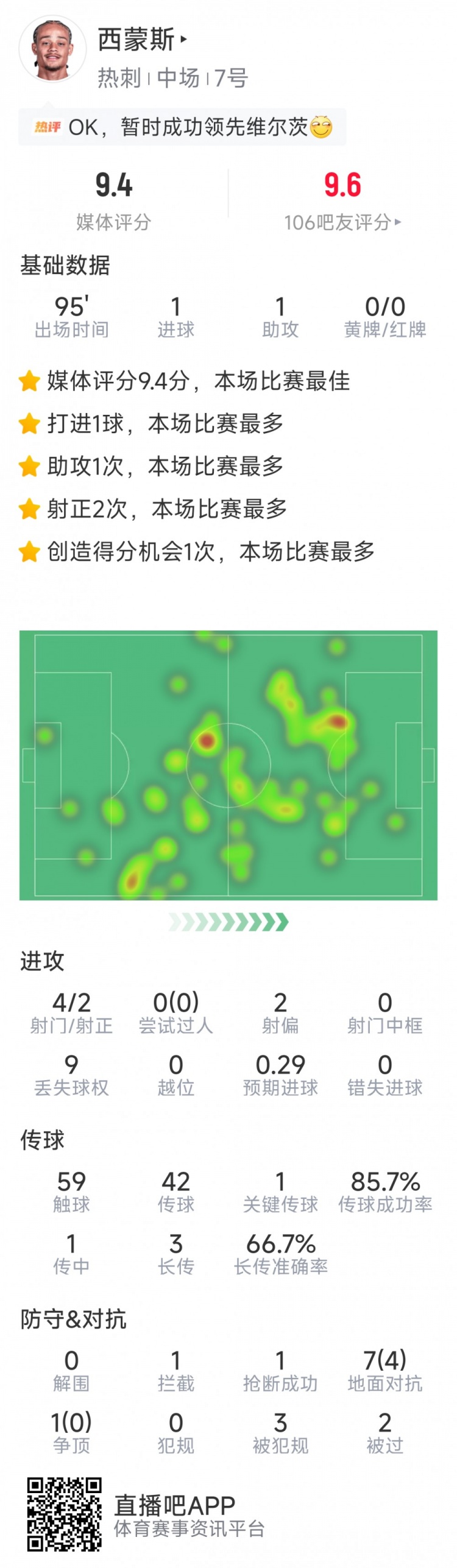直播吧12月7日讯在本轮英超热刺2-0击败布伦特福德的比赛中,哈维·西蒙斯传射建功,以下为他在本场数据: