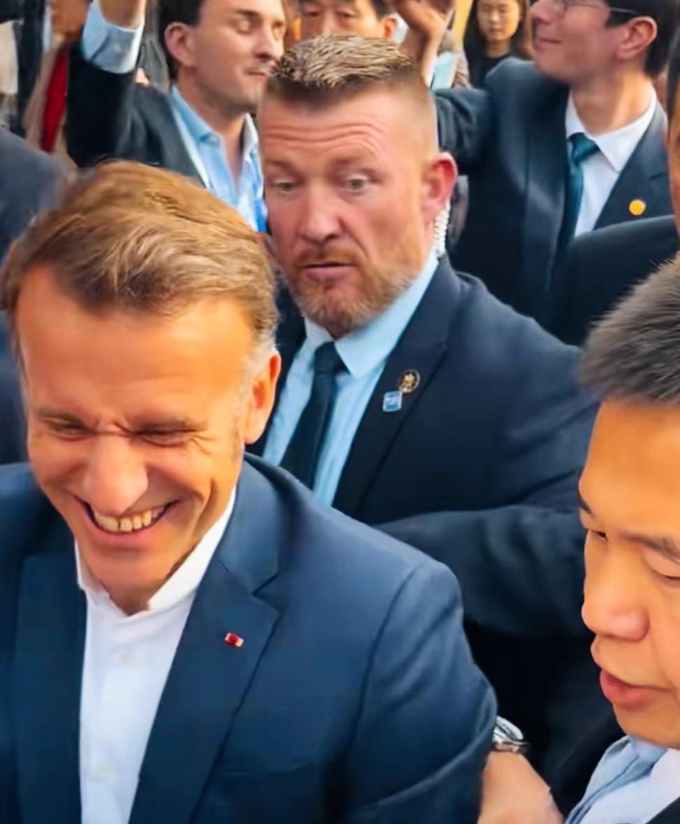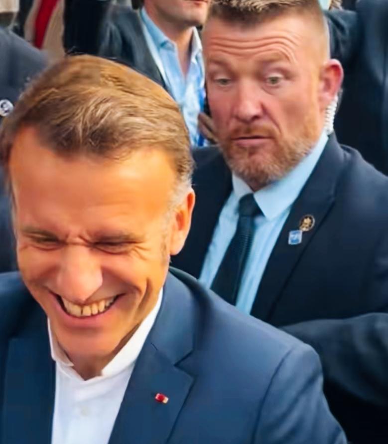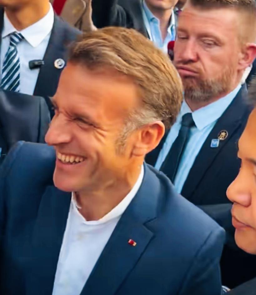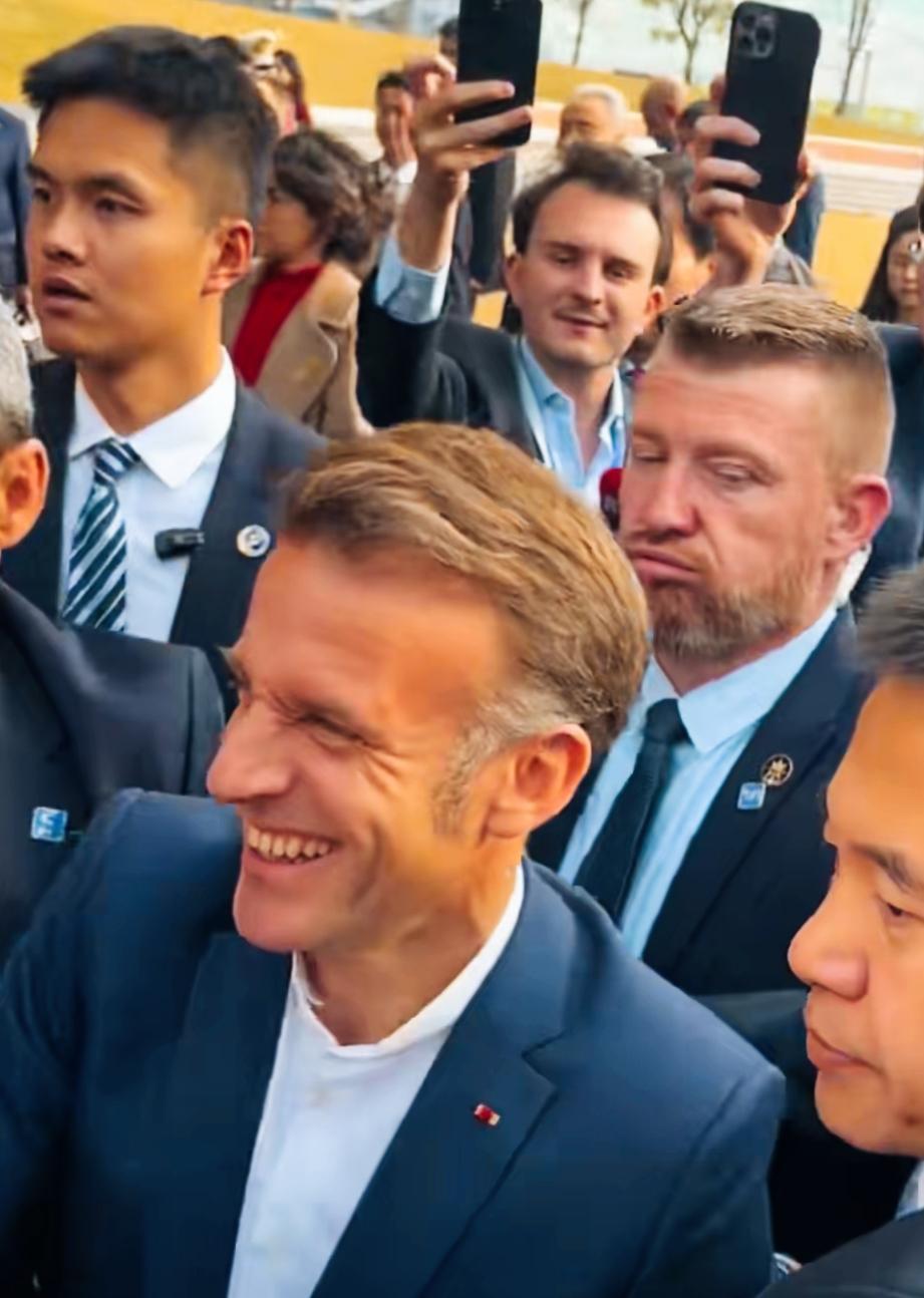 马克龙这随行人员,是不是都没见过这么热闹的场面啊? 面对如此热情的场面,脸上表情都成了表情包了! 这表情是什么意思呢?是紧张吗? 马克龙反而满脸笑容,很高兴啊!