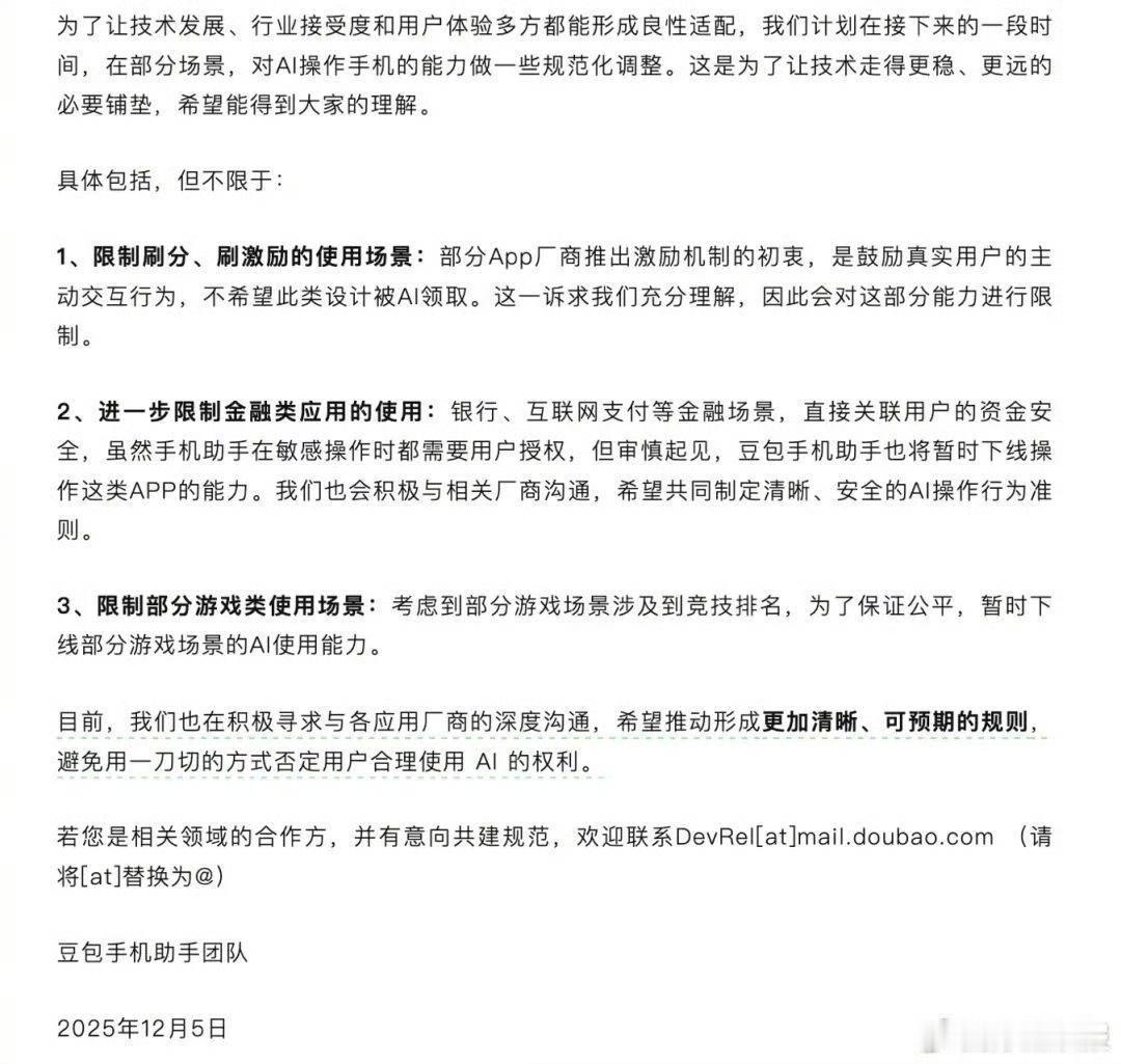 多家APP对豆包手机禁用豆包手机,据说继微信之后,阿里系的很多软件,也对其说不,包括银行App。理由是,这种机器代替人的操作,具有安全风险。豆包手机的逻辑是,豆包助手代替人手操作,人只需要告知即可。这种无障碍模式,原本是视障人士的辅助功能,现在被豆包手机变成了普通用户的增强功能。我觉得,这是一个颠覆性的改变,且势不可挡。尽管它可能被认为涉嫌安全风险,可能加剧机器作弊,也会瓦解现有商业模式——毕竟很多App的商业模式是以真人看到和使用为前提的,但我觉得,这必然是未来的状态。而且在豆包所属公司字节身上,会更加具有特别之处。遥想当年,今日头条这种算法信息客户端刚出来的时候,很多媒体以版权为由联合起来向头条说不,结果如何?现在以算法为推荐的模式,被几乎所有App普遍使用,以及媒体也在抢着上字节系的平台。而未来,豆包手机,或者更直接说,AI助手手机,也必然如此。因为它意味着,手机操作,不再是手,而是完全语音的方式!不再是人看见,而是机器看见即可完成所有指令的方式!是的,对于新事物,当出现认知失调的时候,不要说不,而应该向前一步,拥抱不寻常的变化!豆包手机,或者是AI助手手机,一定如此!