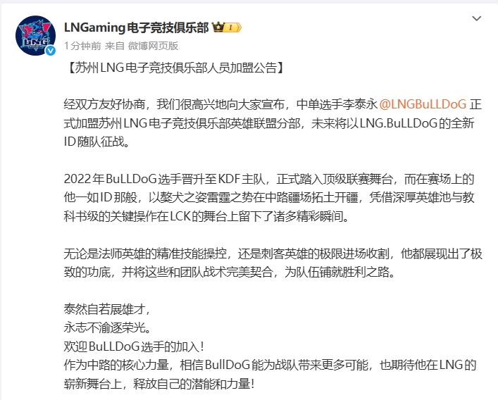 苏州LNG俱乐部官宣:前DNF韩援中单选手BuLLDoG加盟!