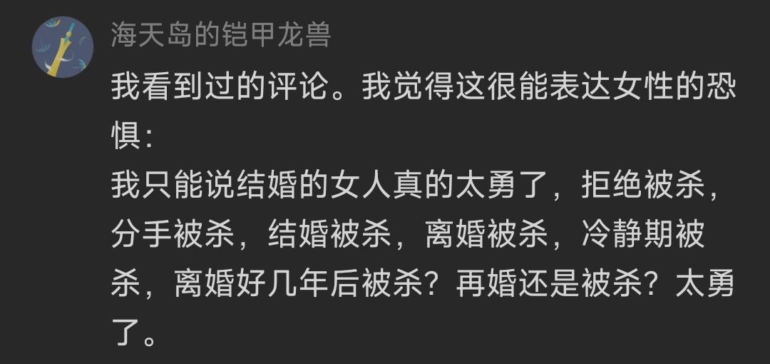 没想到看个小说都有人打拳的。一个描写蔡为封建旧势力桥段,都能打拳说女的现在如何如何被杀。照这么个拒绝被杀,分手被杀,结婚被杀法,哪还有离婚,冷静期,分手好几年之后被杀的事,前面就已经被杀完了。信这个被杀法的,是生活着已经看不到什么活着的婚恋女性了?