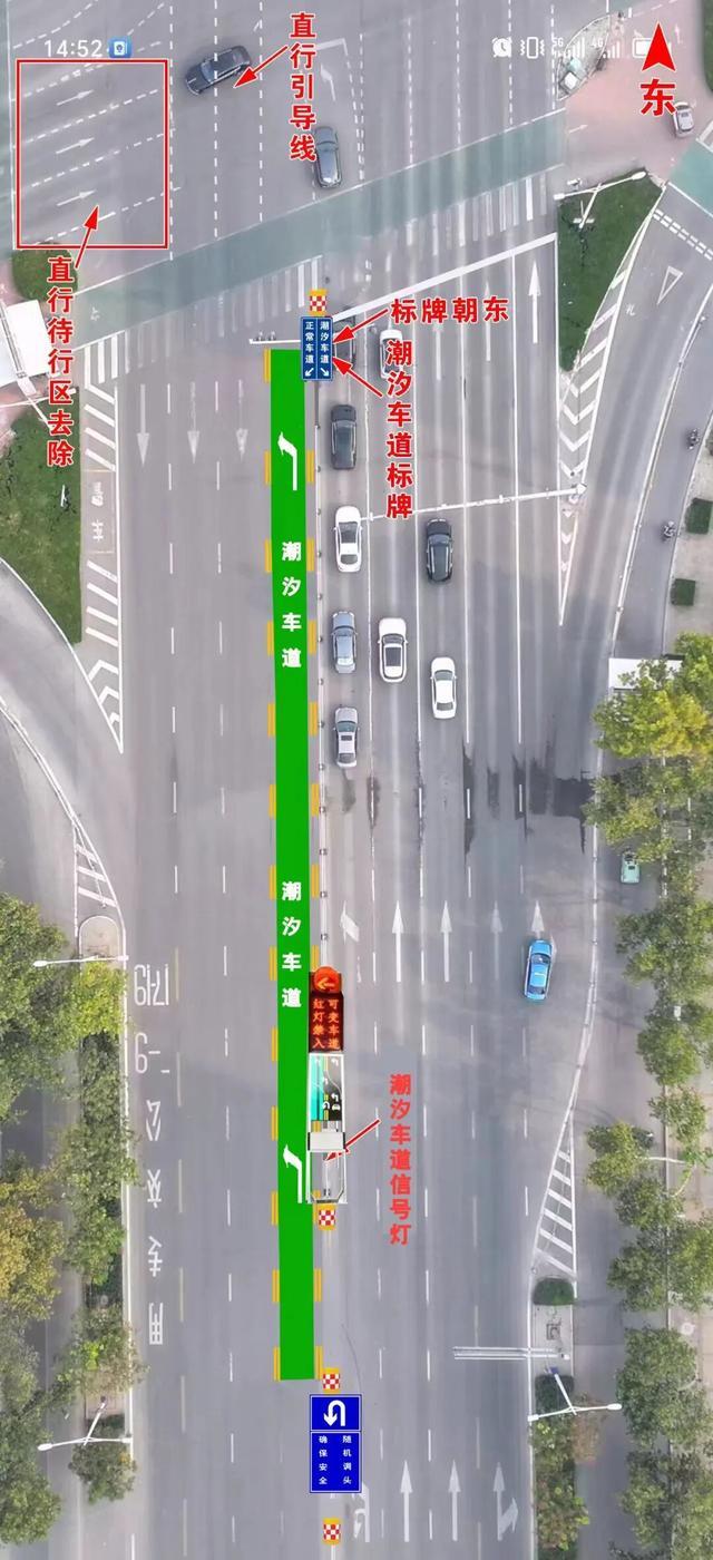 注:每日7:00-9:00东西方向、南北方向信号灯放行方式为先放行左转后放行直行。其他时段潮汐车道禁止驶入,信号灯放行方式为先放行直行后放行左转。