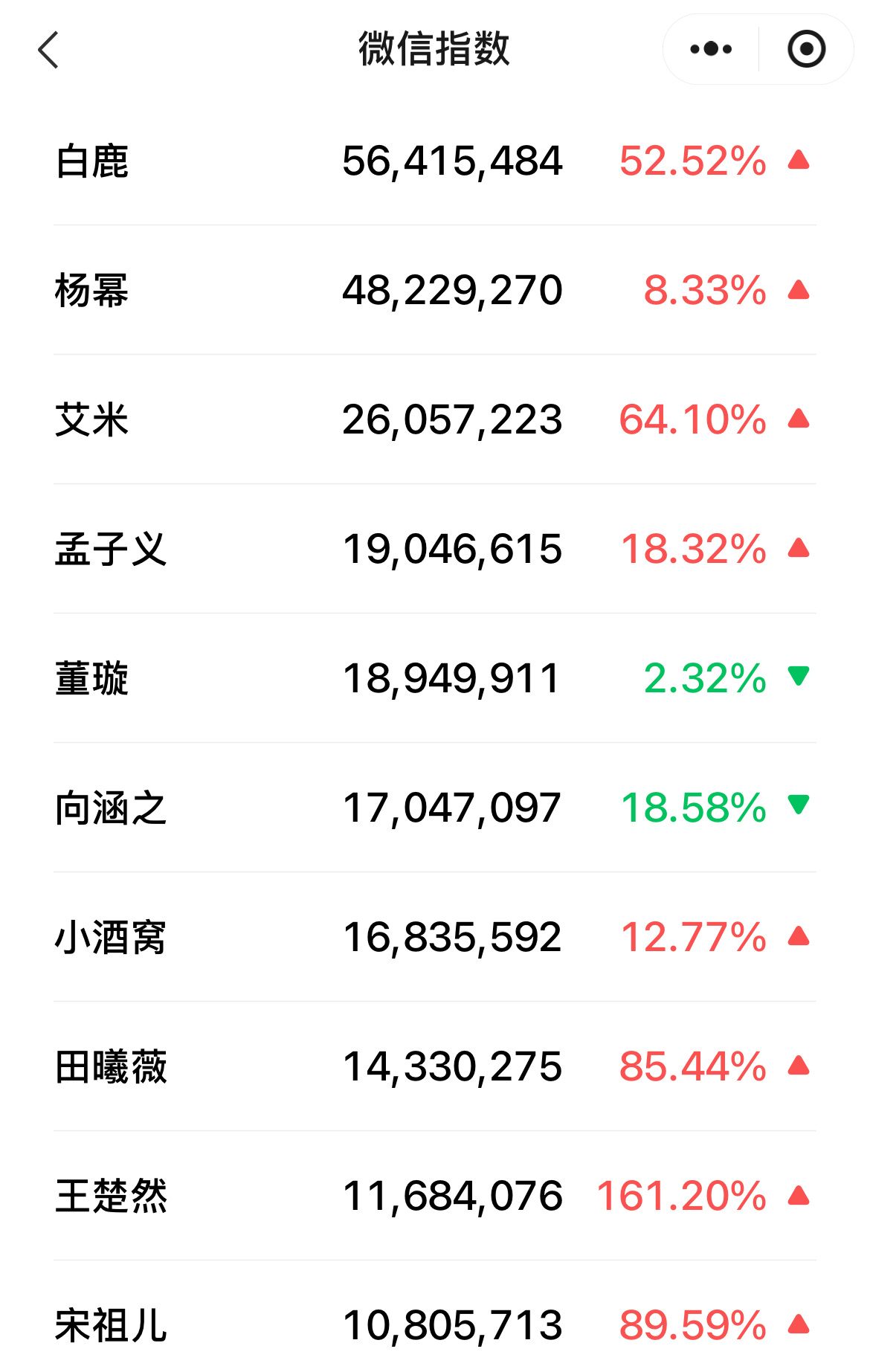 🍉12.6内娱明星微指🈶️恭喜王一博成为微指改版后首位且唯一破亿的男艺人 果然顶流之上就是博子哥恭喜白鹿成为尖叫之夜热度最高艺人姐实在是红遍大江南北王一博微指破亿 肖战 于和伟 刘宇宁 檀健次 陈哲远 任嘉伦 侯明昊 曾舜晞 李现 梓渝 邓为 田栩宁白鹿 杨幂 艾米 孟子义 向涵之 小酒窝 董璇 田曦薇 王楚然 宋祖儿尖叫夜男女艺人微指
