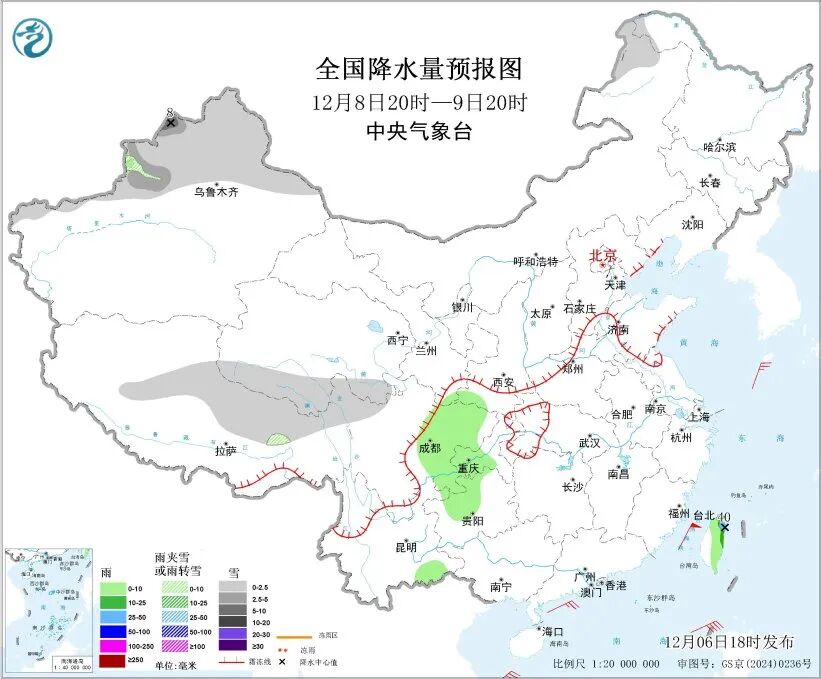 12月11日-13日中东部地区将出现大范围雨雪天气,四川盆地、江汉、江淮、江南、华南及贵州等地有小到中雨,广西中部、广东北部、湖南南部等地局地有大雨或暴雨;新疆、西北地区、华北、黄淮、内蒙古中部、东北地区中南部等地有小到中雪或雨夹雪,局地大雪或暴雪。