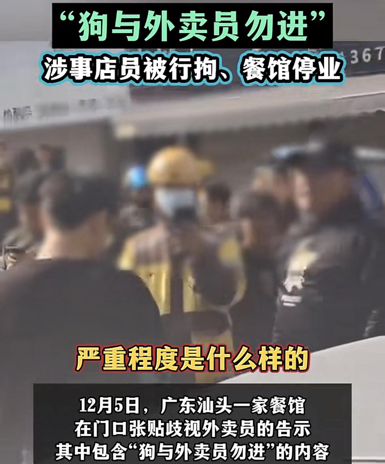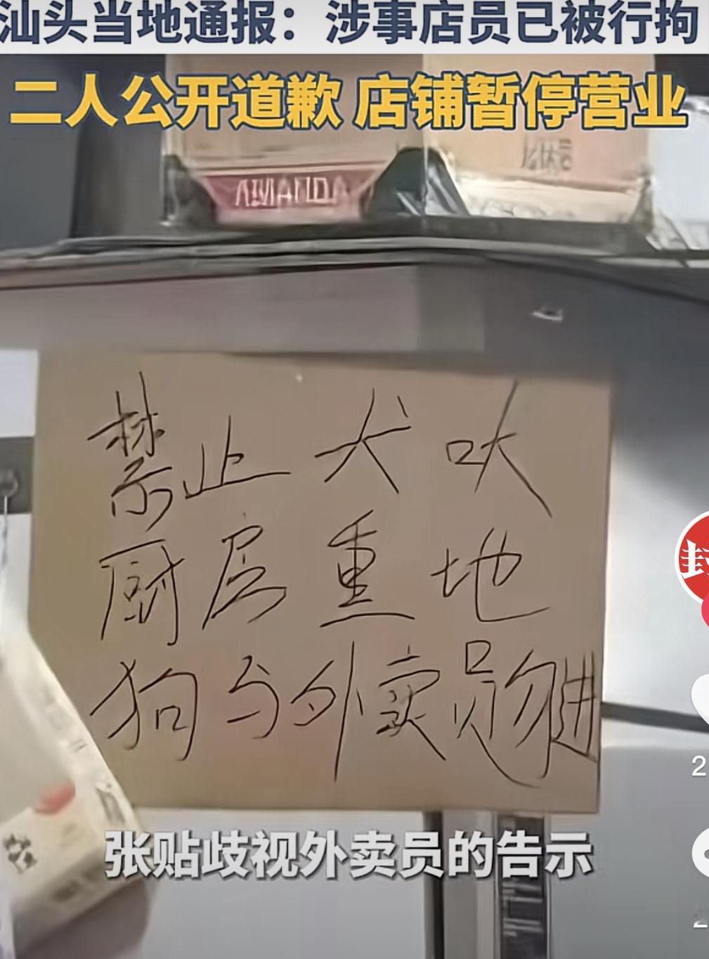 2025年最蠢的一家餐饮店,当属汕头澄海这一家了! 餐馆倒闭有很多种形式,广东汕头澄海这家餐馆却是自找的。什么叫做“专业”,这就是专业,一个打工仔凭实力和计谋把餐馆搞黄了,凭实力把自己送进去了,这种倒闭大快人心。 这种人心里不止歹毒,还扭曲!你也不惦量惦量你警示用词的份量,纸片上的词语是对外卖群体的巨大侮辱,这与百年前的那句:XX与狗不得入内”如同一辙。 作为一名外卖骑手,不管你对小哥有多厌恶,第一时间能想到的就是这句话,这是上百年刺痛每一个国人的一句话。如今说出这句话的居然是自己的同胞,活该倒闭。