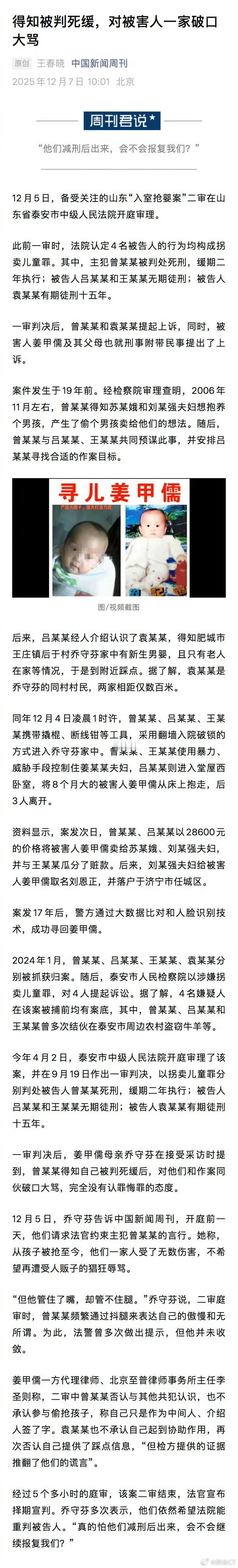 关于「入室抢婴案」,找了几篇相关报道读了下。据了解,这案子是今年9月19日一审判决,今天是二审开庭。本案有4名被告,案发时均有案底在身。最小的被告曾某孩,案发时仅25岁,但在案发后1年曾因盗窃罪获刑11年。稍大的被告王某勇,案发时36岁,案发前因犯强奸罪+盗窃罪,于1995年1月被汶上县法院判处有期徒刑11年,案发后又因犯盗窃罪,于2007年10月被泰安市中院判处有期徒刑12年。再大的被告吕某东,案发时40岁,曾因犯盗窃罪,于1994年8月被肥城市法院判处有期徒刑6年;后因犯盗窃罪+脱逃罪,于1998年5月被任城区法院判处有期徒刑6年。年龄最大的被告袁某勇,案发时47岁,曾因非法拘禁罪,于2013年1月被商河县人法院判处拘役4个月,缓刑6个月。综合来看,4名被告无不是穷凶极恶之徒。但在一审时,罪行最重的曾某孩也不过死缓,另有2人被判无期徒刑,余下1人为有期徒刑15年。最离谱的是,被告之一的曾某孩,在得知自己被判死缓后,曾对同伙及受害人破口大骂,完全没有认错悔罪的态度。二审虽管住嘴,但还是通过抖腿表示挑衅,哪怕法警多次提示,也并未收敛。人贩子被判死缓后对被害人破口大骂