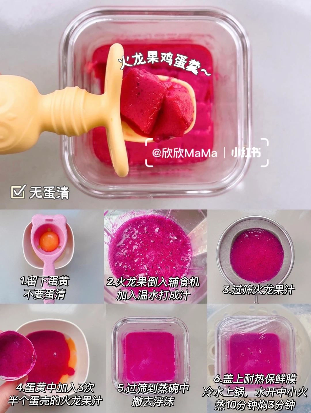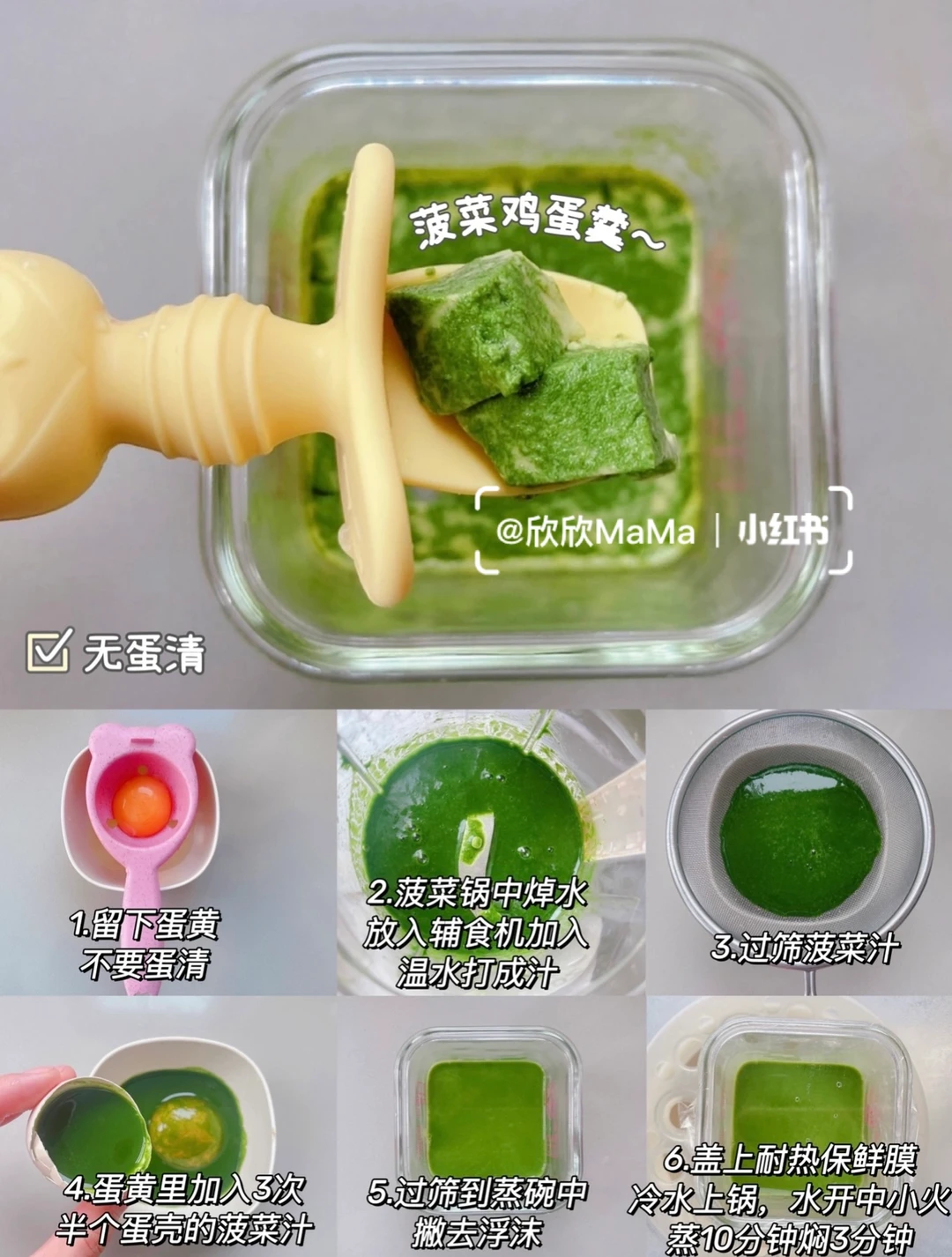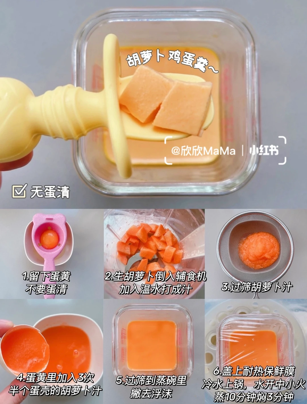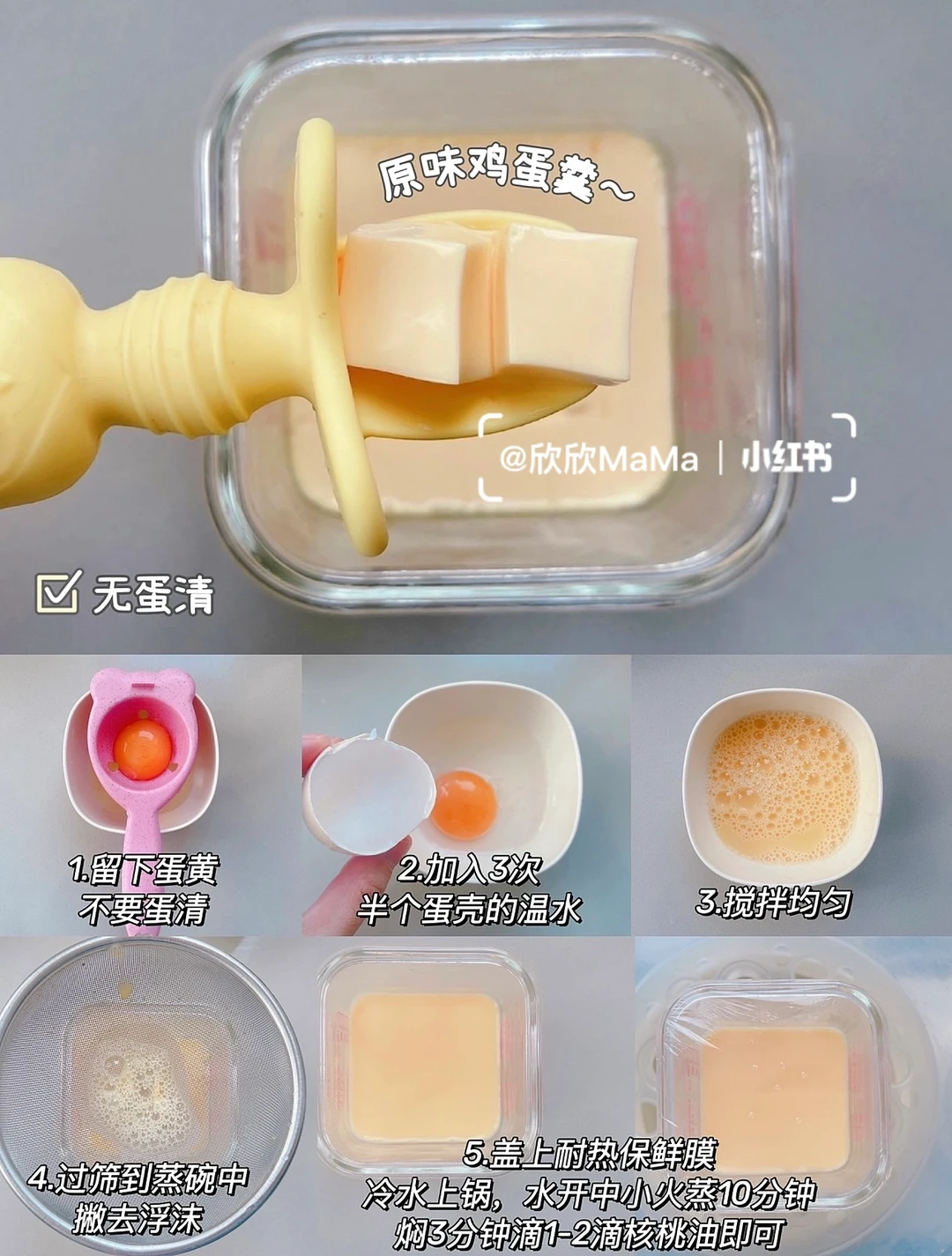 宝宝7个月以后,必须每天保证一盒蛋黄来补充营养 麻麻们赶紧安排起来哦✔️ 让宝宝每天吃不一样的鸡蛋羹,营养满满 〰️ 🥚原味鸡蛋羹做法: 1️⃣:拿一个鸡蛋,留下蛋黄,不要蛋清 2️⃣:蛋黄里加入3次 半个蛋壳的温水 3️⃣:搅拌均匀 4️⃣:过筛到蒸锅中撇去浮沫 5️⃣:盖上耐热保鲜膜戳几个小孔,冷水上锅,水开中小火蒸10分钟焖3分钟 〰 ️ 🥒黄瓜鸡蛋羹做法: 1️⃣:拿一个鸡蛋,留下蛋黄,不要蛋清 2️⃣:黄瓜削皮切块倒入辅食机加入温水打成汁 3️⃣:过筛黄瓜汁 4️⃣:蛋黄里加入3次 半个蛋壳的黄瓜汁 5️⃣:过筛到蒸锅中撇去浮沫 6️⃣:盖上耐热保鲜膜戳几个小孔,冷水上锅,水开中小火蒸10分钟焖3分钟 〰️ 🥕胡萝卜鸡蛋羹做法: 1️⃣:拿一个鸡蛋,留下蛋黄,不要蛋清 2️⃣:生胡萝卜切小块,倒入辅食机加入温水打成汁 3️⃣:过筛胡萝卜汁 4️⃣:蛋黄里加入3次 半个蛋壳的胡萝卜汁 5️⃣:搅拌均匀后 过筛到蒸锅里撇去浮末 6️⃣:盖上耐热保鲜膜戳几个小孔,冷水上锅,水开中小火蒸10分钟焖3分钟 〰️ 🍃菠菜鸡蛋羹做法: 1️⃣:菠菜取一小部分菜叶用清水净泡15分钟(去除杂志)然后菠菜锅中焯水 2️⃣:拿一个鸡蛋,留下蛋黄,不要蛋清 3️⃣:菠菜叶放入辅食机里加入温水打成汁 4️⃣:过筛菠菜汁 5️⃣:蛋黄里加入3次 半个蛋壳的菠菜汁 6️⃣:搅拌均匀后 过筛到蒸锅里撇去浮沫 7️⃣:盖上耐热保鲜膜戳几个小孔,冷水上锅,水开中小火蒸10分钟焖3分钟 〰️ 🎃南瓜鸡蛋羹做法: 1️⃣:南瓜上蒸锅蒸熟 2️⃣:拿一个鸡蛋,留下蛋黄,不要蛋清 3️⃣:南瓜倒入辅食机加入温水打成汁 4️⃣:过筛南瓜汁 5️⃣:蛋黄里加入3次 半个蛋壳的南瓜汁 6️⃣:搅拌均匀后 过筛到蒸锅里撇去浮沫 7️⃣:盖上耐热保鲜膜戳几个小孔,冷水上锅,水开中小火蒸10分钟焖3分钟 〰️ 🥀火龙果鸡蛋羹做法: 1️⃣:留下蛋黄,不要蛋清 2️⃣:火龙果切块倒入辅食机加入温水打成汁 3️⃣:过筛火龙果汁 4️⃣:蛋黄里加入3次 半个蛋壳的火龙果汁 5️⃣:搅拌均匀后 过筛到蒸锅里撇去浮 6️⃣:盖上耐热保鲜膜戳几个小孔,冷水上锅,水开中小火蒸10分钟焖3分钟 .