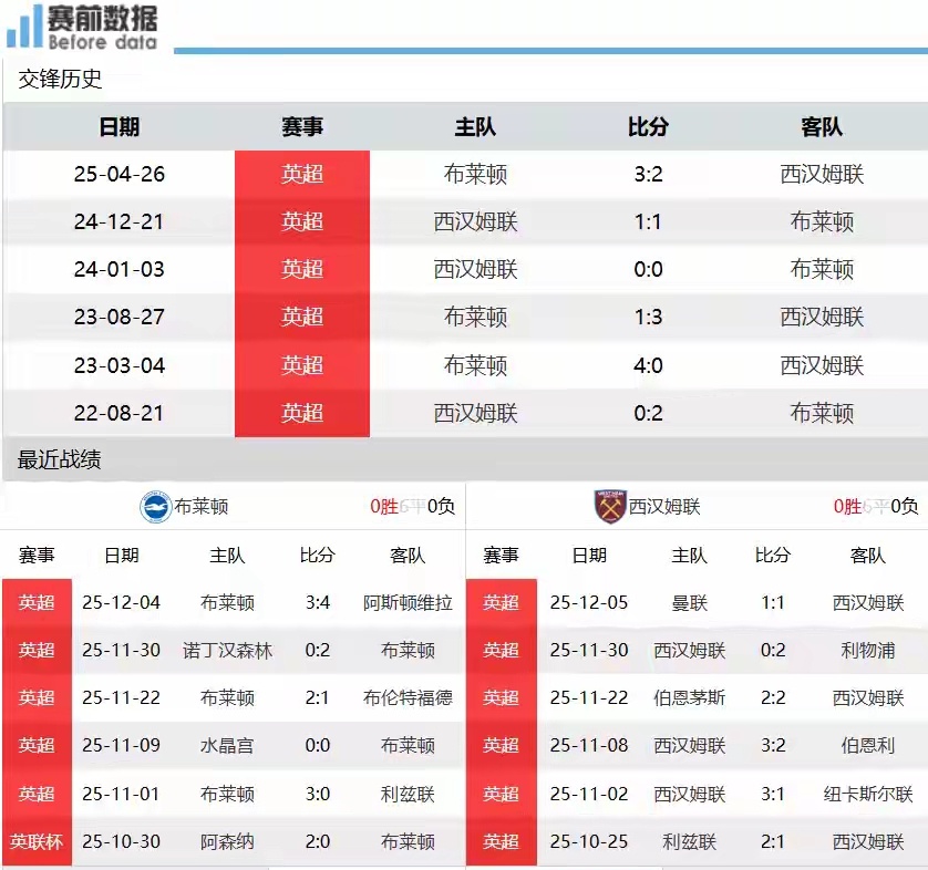 布莱顿vs西汉姆联英超第15轮前瞻:努诺主打反击战术 布莱顿主场难言稳胜北京时间12月7日22点,英超第15轮焦点战打响,布莱顿坐镇主场迎战西汉姆联。积分榜与近期状态:英超14轮战罢,布莱顿6胜4平4负积22分位列第10,西汉姆联3胜3平8负积12分深陷降级区(第18位)。布莱顿上轮主场2球领先却3-4遭阿斯顿维拉逆转,联赛4轮不败走势终结;西汉姆联则客场1-1逼平曼联,近5轮仅1负,状态明显回暖。战术博弈:努诺接手西汉姆联后,球队仍在降级区挣扎,但这位以反击战术见长的教练,此役大概率会率队以稳守反击姿态客战布莱顿。尽管布莱顿本赛季整体发挥平稳,但面对志在保级、全力抢分的西汉姆联,主场想要稳稳拿下胜利难度不小,更看好西汉姆联能在客场带走积分。交手记录方面,布莱顿近6次对阵西汉姆联取得3胜2平1负,占据历史交锋优势。伤停情况:布莱顿阵中韦伯斯特、米尔纳、马奇、齐马斯、三笘薫均无法出战;西汉姆联则有斯卡尔斯、萨默维尔、法比安斯基缺阵。