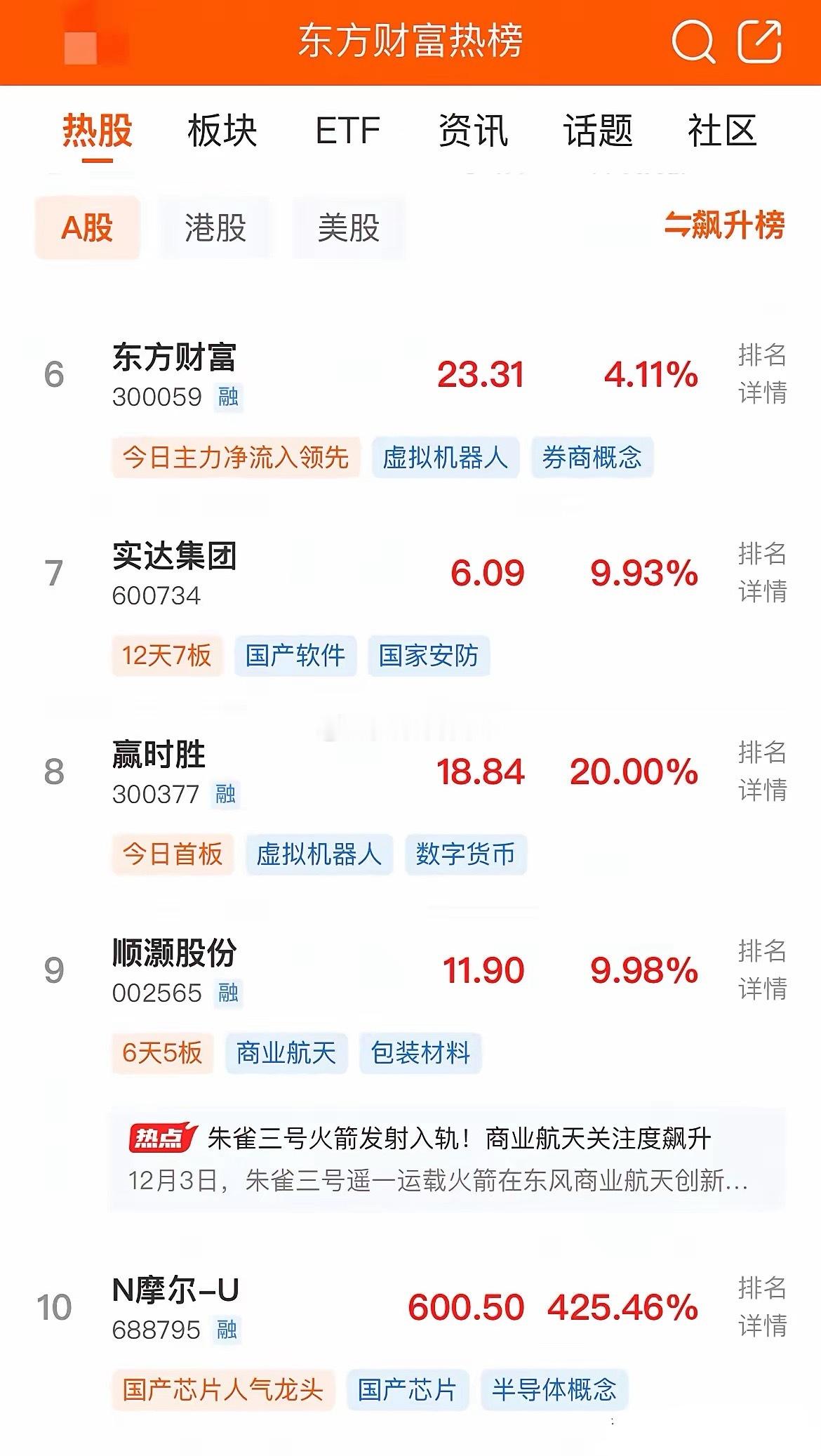 周末东财人气股榜单:1、航天发展,16天10板,商业航天利好消息频发+SpaceX估值已飙升至8000亿美元2、龙洲股份,3连板,福建+人形机器人+商业航天三大概念加持3、海王生物,8天7板,没有什么热门概念加持,但就是能连板4、航天科技,首板,还是商业航天5、国脉科技,首板,6G,人气飙升6、东方财富,周五异动,券商利好+互联网券商龙头当仁不让7、实达集团,12天7板,福建+AI应用8、赢时胜,20cm首板,互联金融9、顺灏股份,6天5板,商业航天、商业航天,还是商业航天10、摩尔线程,24万一签的打新神话,股民也想看看是向上继续神话还是跌落神坛从上也可以看出,本周末最热门的概念还是非商业航天概念莫属,前10就有4个属于该概念!但是需要提醒大家的是商业航天的部分个股涨幅已经相当大了,随时存在资金落袋为安的情况,因此奉劝大家还是谨慎追涨!