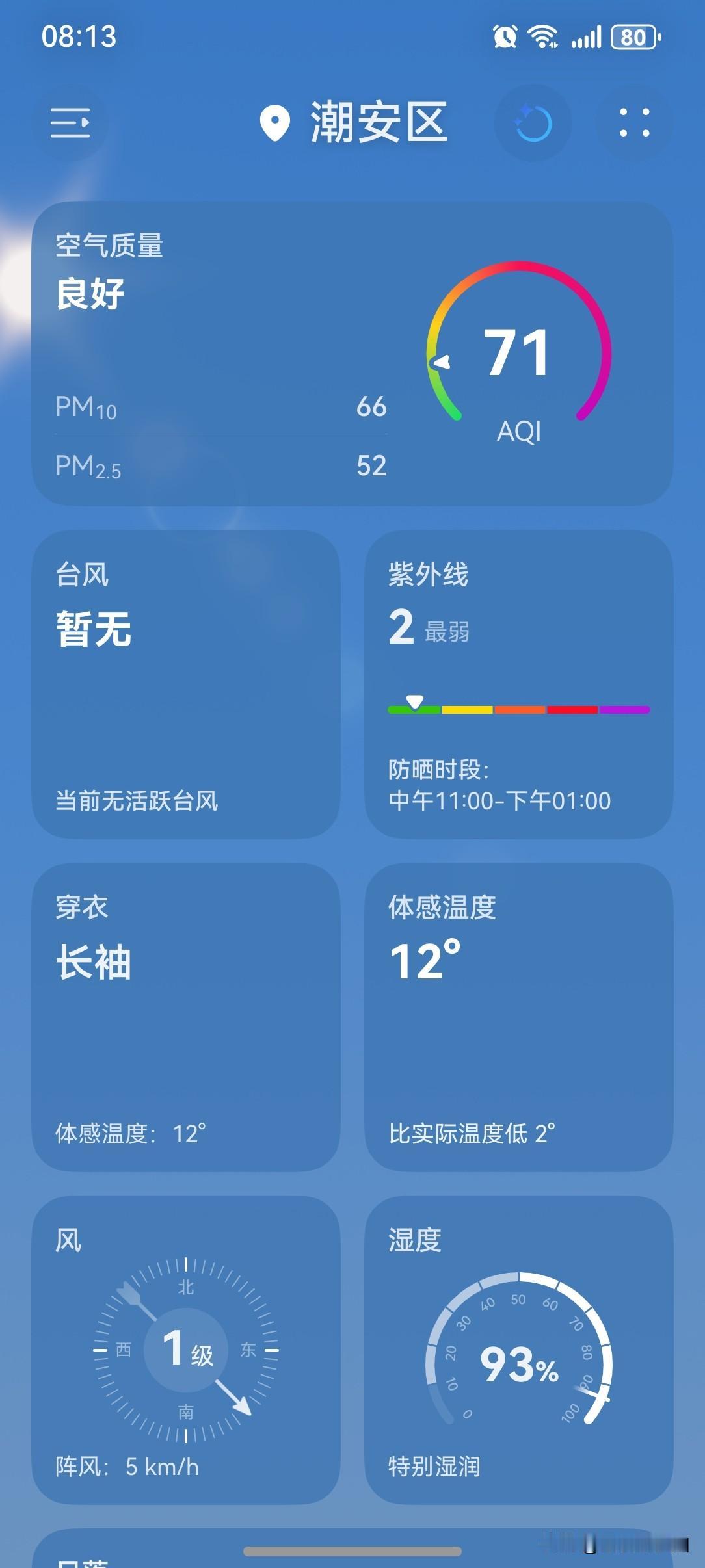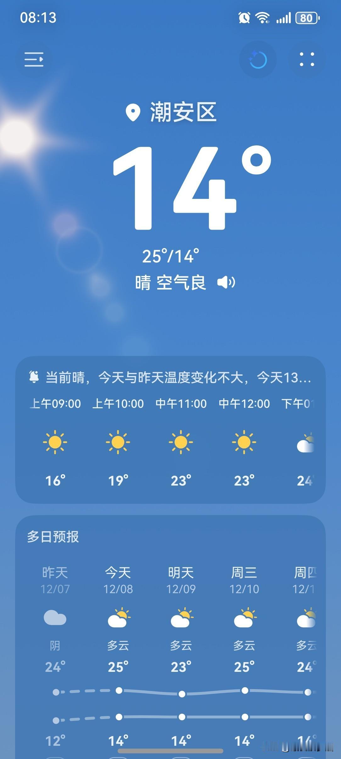 广东:晴朗干燥天气模式持续开启中! 8~10日,广东省大致天晴干燥,部分地区早晚有轻雾或雾,其中,中南部地区云量将逐日增多,10日前后转为阴天,并且有分散零星小雨;昼夜温差比较大,早晚寒凉。小伙伴们需要注意根据温度变化增减衣物,慎防感冒病毒的滋扰。 今天(8日),潮州喜提一个大好晴天,气温14~25℃,此刻气温14℃,体感温度12℃。 今天的全天最高气温虽然高达25℃,但早晚的温度还是比较低的,体感温度会更低一些,外套还是得穿上啊! 看看今天的天空!太阳一早上线营业,驱除寒意,晒着太阳的时候的确暖和多了。只要有阳光,就会暖起来的。上午应该会快速升温,暖意融融的一天又开始啦! 周末又有冷空气要来,不仅如此,还会有雨水来袭,一波降温是免不了的。但就目前的天气状况来看,还是非常好的,咱们就接着奏乐接着舞吧!舞到几时算几时! 今天的天气从整体来讲,还是非常不错的!除了昼夜温差有点大以外,其它的都还好,依然值得一个五星好评。 如此天气!元芳,你怎么看? 创作训练营2期开营啦