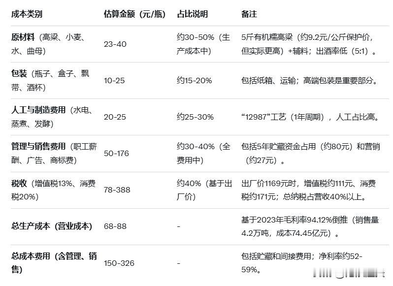 一瓶飞天茅台的成本究竟有多少? 53度500ml的飞天茅台作为高端白酒,其成本结构复杂,不仅包括直接生产原材料,还涉及人工、包装、制造费用、管理费用、销售费用、贮藏成本以及税收等。根据贵州茅台的财报和公开分析,成本说法众多,大致范围以“30~80元”区间最为集中,但这些多为简化估算,忽略了全链条费用。 从茅台集团官方数据倒推,一瓶飞天茅台的营业成本(生产成本)约为68-88元,如果加上管理、销售等所有费用和税收,总成本费用可达150-300元左右,2023年后出厂价约1169元,毛利率高达94%以上。 2023年茅台酒销售量约4.21万吨,营业成本74.45亿元,平均每吨17.68万元,约88元/瓶。2021年出厂价每瓶969元,每瓶成本约70元。 茅台的核心价值在于品牌、文化和稀缺性。另外茅台酒产能受限,还需要5年陈酿时间,而非材料特殊。市场零售的高溢价主要来自经销商和收藏。