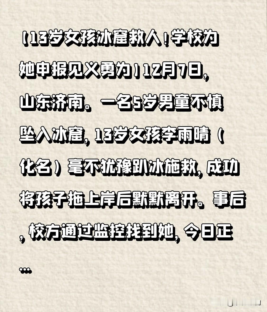 【13岁女孩冰窟救人!学校为她申报见义勇为】 12月7日,山东济南。一名5岁男童不慎坠入冰窟,13岁女孩李雨晴(化名)毫不犹豫趴冰施救,成功将孩子拖上岸后默默离开。事后,校方通过监控找到她,今日正式为其申报“见义勇为”荣誉!“我只是做了应该做的事。”她说。英雄不问年龄,为小姑娘点赞! 救人少女