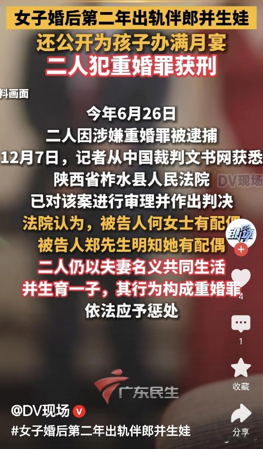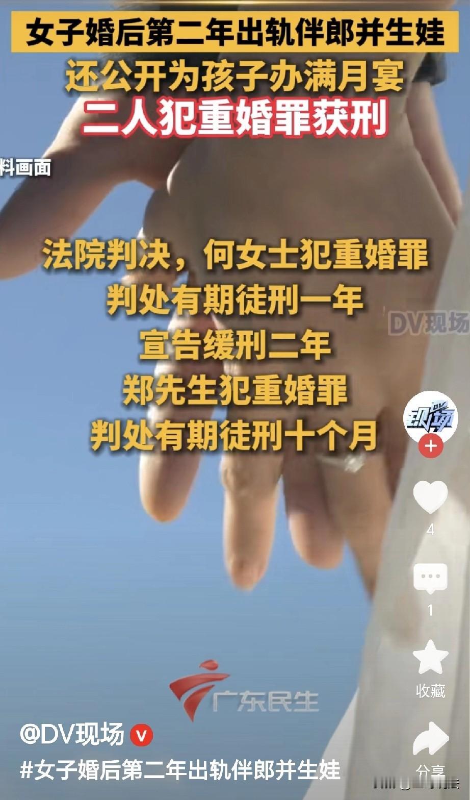 陕西柞水,一28岁女子,丈夫常年在外打工,婚后第二年时,女子和伴郎发生了不正当的关系,俩人高调住在了一起,还生了儿子,他们对外自称,俩人才是夫妻,他们大摆晏晏,给孩子办满月酒,宴席上还请来了双方的亲朋好友,谁知得意忘形,二人没有想到,丈夫报警,结果令二人傻眼了。 程先生痛心疾首,自己才结婚两年,妻子就背叛了自己,她不但和别的男子住在一起,他们对外还以夫妻相称。 不仅如此,妻子还和别的男子生下了儿子,而男子并非外人,而是程先生和妻子结婚时的伴郎郑某。 原来,2019年12月19日,程先生和何女士牵手,俩人举办了隆重的婚礼。 婚礼上的何女士穿着婚纱,她光彩夺目,满脸洋溢着幸福的笑容。 郑某作为程先生的朋友,被他邀请做了伴郎,只见他西装革履,梳着背头,他忙前忙后,给这对新人送上了祝福。 程先生心里高兴,新婚燕尔,他举杯感谢着亲朋好友,他暗自下了决心,有了妻子,他要更加的努力奋斗。 婚后不久,程先生就揣着梦想,外出打工,他想着多挣点钱,让小家庭的日子越过越好。 何女士不愿意了,丈夫外出,聚少离多,这就意味着她要常年独守着空房。 起初的一年,她也恪守着职责,每天日出而作,日入而息。 可是一到晚上,她就孤孤单单,心里忍不住开始胡思乱想。 这个时候,她脑子里蹦出一个人,婚礼上的伴郎郑某给她留下了深刻的印象。 不久之后,郑某就开始和何女士频繁的来往,随着感情的升温,俩人突破了防线,管他什么道德伦理,俩人直接住在了一起。 这个时候,刚好距离何女士结婚一年,远在外面的程先生一点也不知道妻子在做什么。 到了后来,何女士和郑某不再满足偷偷摸摸,俩人干脆搬到一起居住了。 再到后来,何女士怀孕,她和郑某更是出双入对,公开以夫妻名义开始生活。 周围的邻居看在眼里,有人在背后议论纷纷,可两人全然不顾,俨然一副夫妻的模样。 2022年12月4日,何女士生下了一个男孩,她在医院分娩的时候,郑某以配偶的身份,在各种文件上签字。 程先生远在外地,这一切都被蒙在鼓里,他偶尔打电话回来,何女士只是敷衍了事。 2023年2月15日,何女士和郑某大张旗鼓,在当地的餐厅给孩子办满月宴。 他们得意洋洋,认为他们才是真正的夫妻,甚至邀请了双方的亲属来喝孩子的满月酒。 宴会之上,两人抱着孩子,接受着祝福,俨然是幸福的一家三口。 此后,何女士理所应当,带着孩子和郑某生活,孩子生活的费用由郑某负责。 两人忘乎所以,早已忘记何女士还有个丈夫,他们对外以夫妻相称,毫无顾忌,根本不去想后果将会如何。 他们得意之及,程先生早就被二人抛到了脑后,谁知意外发生,2023年3月29日,郑某被捕。 他因为犯了非法狩猎罪,被法院判处有期徒刑10个月,至此而止,他和何女士的夫妻生活才算结束。 而远在外地的程先生,慢慢听到了闲言碎语,起初他不相信,以为不过是别人挑拨他们的夫妻关系。 程先生几次提出回家看看,都被何女士找各种理由推脱,程先生这才觉得不对,急急忙忙赶回了家里。 面对程先生的质问,何女士再也瞒不下去,终于承认了自己和郑某的关系。 程先生难过至极,自己在外辛辛苦苦打工,省吃俭用养家,到头来却被瞒的如此的辛苦! 程先生愤怒之下,收集了相关证据,他直接报警。 经过调查,何女士和郑某的行为已经构成了重婚罪。 2025年6月26日,何女士和早已经刑满释放的郑某被依法逮捕。 有人认为,这不对呀,难道女方家长不知道女儿已经结婚了吗? 已婚的女儿跟别人生孩子还举办满月宴,还去参加,什么样的妇父母才能接受这样的事情,真是搞不懂了。 可是林子大了,什么人都有,也许当时的人都以为女的离了又结了呢。 可这位原配的丈夫程先生却不知道是怎么回事,即便是外出打工,也不可能是一年到头都不回家。 至于其中到底是怎么回事,大概只有当事者自己心里清楚。 可是这位何女士也是奇葩,你如果实在过不下去,完全可以先结束这段婚姻,再去寻找自己的幸福,何必以身试法,最终自食其果! 法网恢恢,疏而不漏,何女士和郑某终归要为自己的行为付出代价。 《刑法》第258条规定: 有配偶而重婚的,或者明知他人有配偶而与之结婚的,处二年以下有期徒刑或者拘役。 何女士与程先生已缔结合法婚姻关系,在婚姻存续期间与郑某以夫妻名义共同居住、生育子女。 他们还公开举办满月宴并邀请亲友见证,形成事实上的婚姻关系,属于典型的重婚行为。 郑某作为程先生的朋友,明知何女士已婚,仍与其以夫妻名义同 ju、生育子女,主观上存在故意,客观上实施了重婚行为,同样构成重婚罪。 两人的行为不仅伤害了程先生的情感与权益,也扰乱了婚姻家庭秩序。 最终法院判决,何女士和郑某重婚罪成立,判处何女士有期徒刑1年,缓刑2年,判处郑某有期徒刑10个月。 关注@王哥说法 多学法律少吃亏!