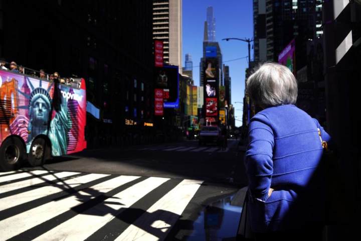 10月1日,在美国纽约曼哈顿的时报广场附近,行人等待过马路。新华社记者吴晓凌摄