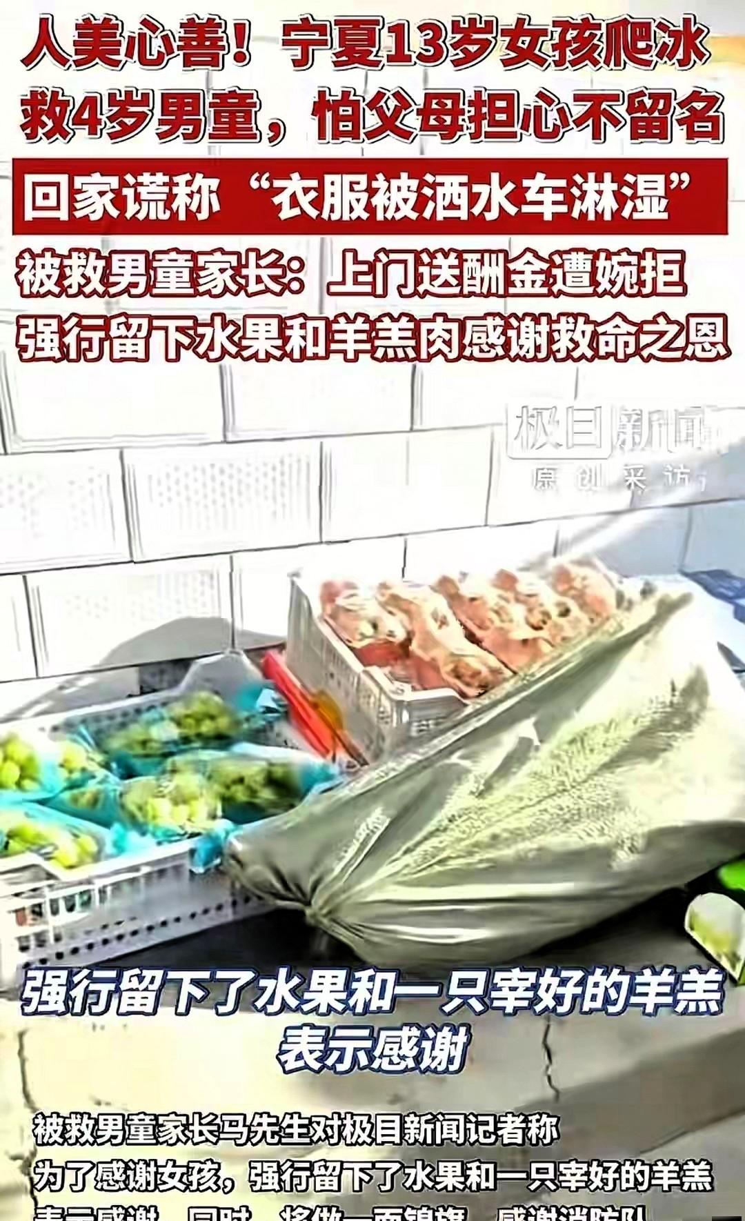 宁夏13岁少女冰河救孩童, 家长硬塞万元现金遇冷,羊肉礼物背后藏着啥秘密? 宁夏有个13岁女孩叫李佳婷,上星期一个男孩掉进河里,她跳下去把人救上岸,自己浑身湿透回家。 父母问她怎么弄的,她说被洒水车淋湿了,直到媒体报道才知道真相。 男孩家长上门感谢,带了一万块钱、水果和半只羊。 女孩爸妈说救人是应该的,钱不能收,但羊和水果留着了。 他们说孩子从小受的教育就是帮助别人不图回报。 这事在周围传开后,学校给女孩发了奖状,网上也都在讨论见义勇为要不要收钱。 现在这事在网上讨论得挺热络,很多人夸这姑娘实在。