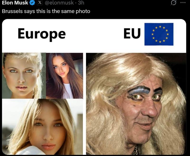 马斯克史无前例大口径炮轰欧洲 欧盟以违反《数位服务法》的打假规定为由,对X平台开出1.2亿欧元罚单,把马斯克彻底整火了! 这一火,便不管不顾,爆出关于欧盟的大量猛料—— 欧盟的“美少女”人设,一夜之间打回原形,坠为“老巫婆”! 不然的话,那就不是马斯克。 两条爆料,一条猛似一条: 第一条—— 马斯克说,欧盟曾要求他在2024美国大选期间,特别审查特朗普的言论。 如果坐实,早就批评欧盟“政治正确”的特朗普,岂会善罢甘休。 第二条—— 马斯克说,欧盟委员会曾向他提出了一项非法的秘密交易:如果X平台悄悄地审查言论而不对外公布,就不予罚款。 显然,马斯克没有满足欧盟的要求。 但是,到处叫喊言论自由的欧盟,如何自圆其说,把这段黑历史给搪塞过去,可不是件容易的事。 这两条都够劲爆的! 但是相比之下,还有更强的梗—— 那就是马斯克对欧盟的两个批评、两个建议。 批评之一,马斯克说—— 欧洲正在梦游般地走向毁灭。过度监管严重阻碍了欧洲的进步和创新,就像慢性窒息,不会在某个瞬间觉得一切结束,但脖子上的绞索每年都收紧一点,最终扼杀欧洲。 谁导致的,除了欧盟,还能有谁? 批评之二,马斯克说—— 欧盟不是人民统治的民主,而是未经选举的官僚统治。欧盟的布鲁塞尔总部简直就是一座官僚机构的巨型教堂。如果想参观官僚机构的“大教堂”,就去欧盟总部。 最大的官僚是谁,当然是女强人冯德莱恩。 问题在于,她遇到了个男强人,马斯克。另外一个更狠的还没发话,那就是大统领。 建议之一,马斯克说—— 欧盟应该被废除,主权归还给各国,让各国政府更好地代表各自人民。 建议之二,马斯克说—— 欧洲人民应当退出欧盟,恢复主权。 马斯克还专门强调,“我是认真的,不是开玩笑。” 美国的大官儿们,无一例外支持马斯克,代表人物是美国务卿鲁比奥。 鲁比奥说,欧盟的罚款不仅仅是对X平台的攻击,更是外国政府对所有美国科技平台和美国人民的攻击。 果然是极派人物,这上纲上线,一下子拉满! 美国政府和欧盟的正面冲突,看来不可避免,就看谁先认怂服软。 回想欧盟以前,打着自由、民主、人权等等旗号,对中国的横加干涉和指责,不禁哑然失笑—— 欧盟啊,不过就是一只衣冠楚楚、表里不一,就怕被人扒去外皮的老狐狸。 但是,洒家最想看的戏,还是—— 美国、欧盟这两个西方世界的前两把交椅,这场热闹戏码,如何继续演下去。