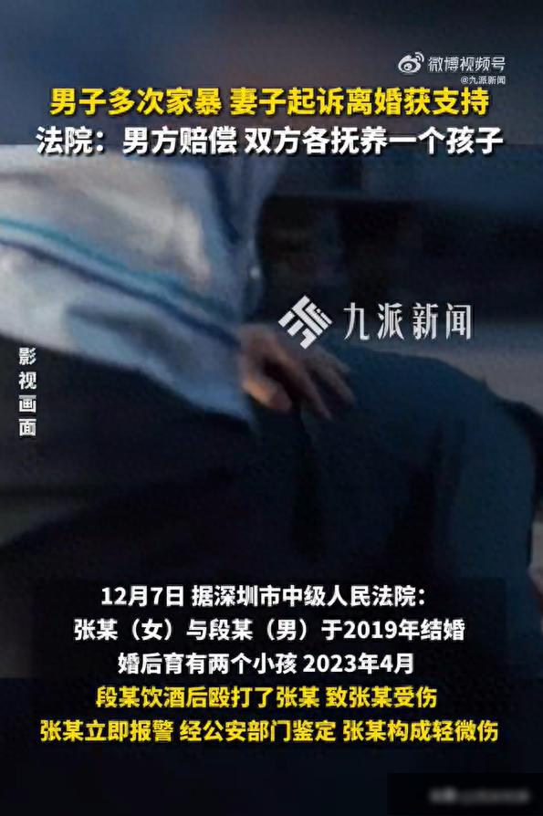 12月7日,九派新闻从深圳市中级人民法院获悉:张某(女)与段某(男)于2019年结婚,婚后育有两个小孩。2023年4月,段某饮酒后殴打了张某,致张某受伤。张某立即报警,经公安部门鉴定,张某构成轻微伤。事情发生后,段某被处以500元行政处罚。张某认为其与段某感情已破裂,于当月向法院提出离婚诉讼请求,并请求孩子小易(化名)由自己抚养,孩子小丁(化名)由段某抚养,各自承担抚养费,由法院一并处理探视权;同时请求法院判决段某支付张某人身损害赔偿和精神损失费。段某辩称自己当天喝了酒,是多年的生活压力导致其与张某产生争执,家暴是无意识下作出的行为,并非故意,不同意离婚。