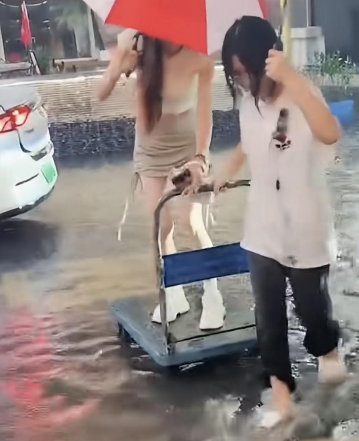 女子打扮的很精致去上班 不料,却遭天降暴雨 就在她下车的这个时候,闺蜜拉着推车出