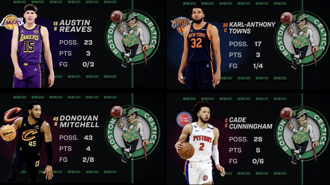 图中列出了近十天凯尔特人球员乔丹-沃尔什在防守多名明星球员时的表现。