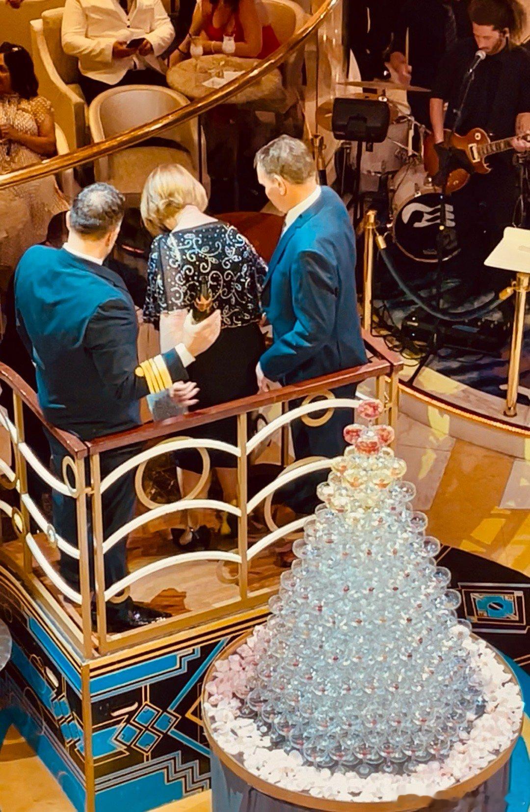 生活手记海上第三天,继续前行,时差五个小时阳光明媚,风也没昨天大。在甲板上散步,海风丝丝凉意,需要防晒,戴墨镜。似乎已经适应了船上的摇摇晃晃,对生活作息基本没影响,但估计我以后不再会邮轮之旅。晚餐大家都穿得很正式,因为有船长欢迎仪式,现场乐队表演,围观船长主持倒香槟塔,够热闹😄