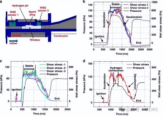 中国空气动力研究与发展中心(CARDC)的直连式超音速燃烧风洞能够产生马赫数为1.5–4.0的超音速流体,测试实验在马赫数2.0条件下进行。如图5a所示,所提出的MEMS壁面剪应力传感器被策略性地布置在超燃冲压发动机燃烧室上表面的隔离段和扩压段,并同步测量壁面压力。这种双测量配置能够系统地表征在不同气动阶段的可压缩流体参数演化。相关测试结果如图5b-5d所示。