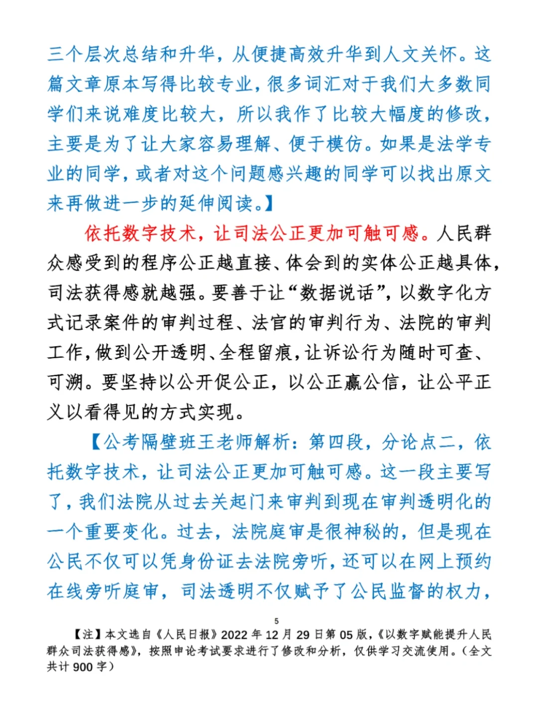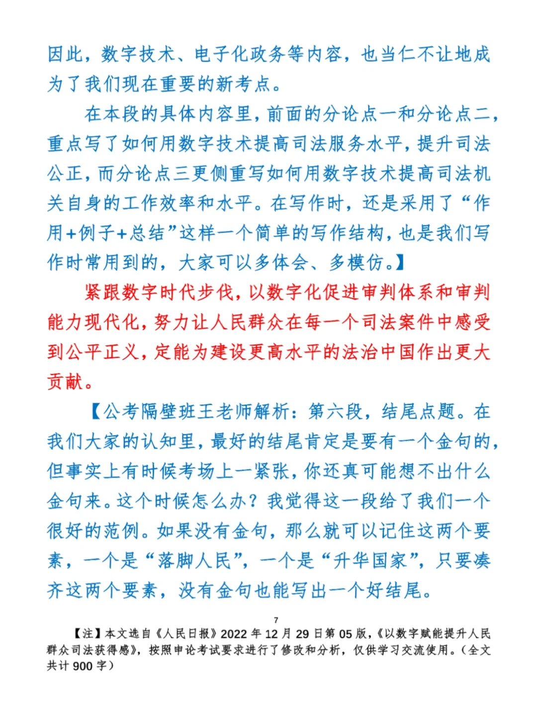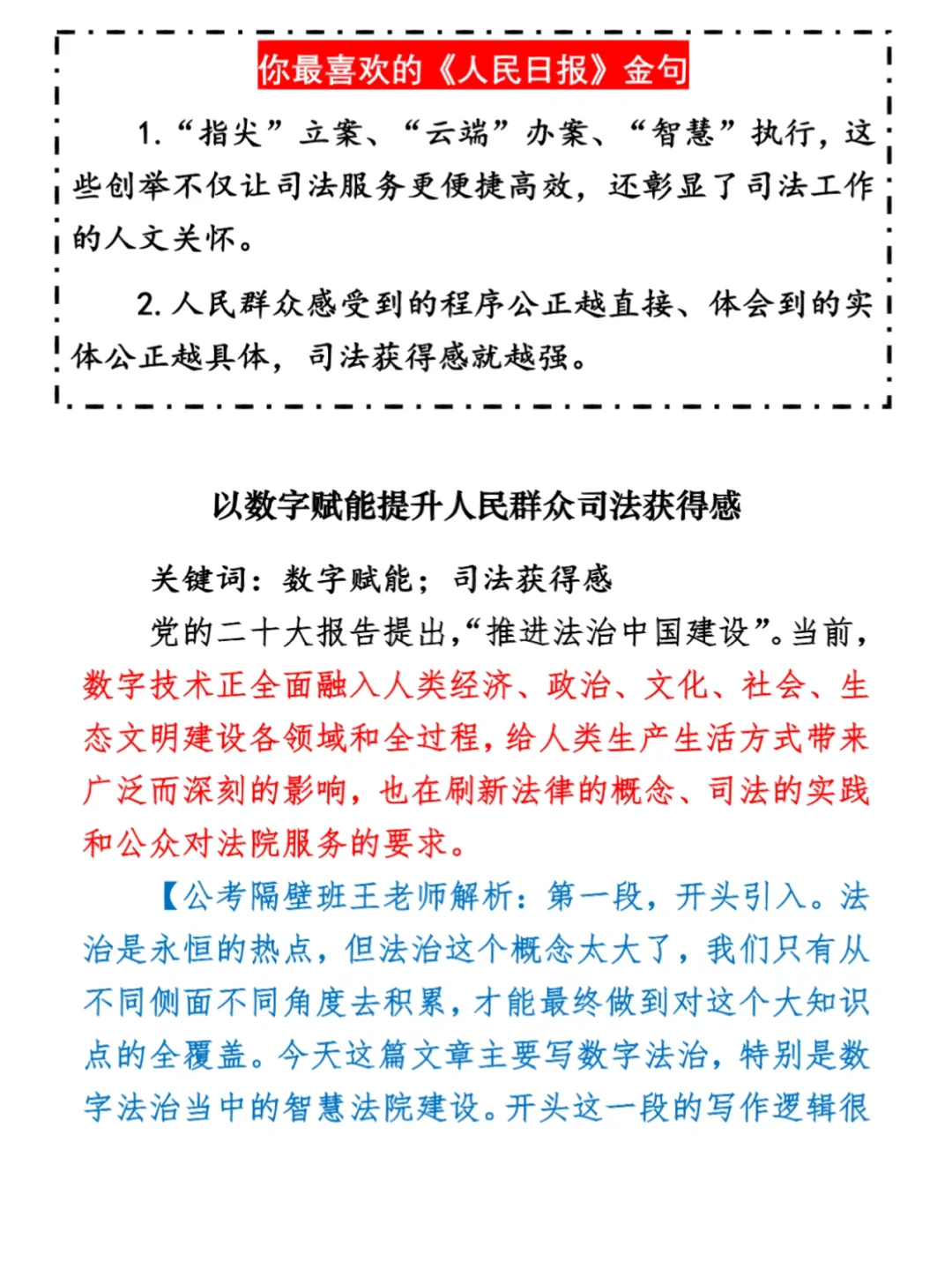今日打卡作业: 1. 选一句你最喜欢的金句 2. 抄写全文红字+划线部分内容 3. 写完后在留言区打卡 ⭐️ ⭐️ ⭐️ ⭐️ ⭐️ ⭐️ 如何抄写:每天的抄写文章以图片形式发在“公考隔壁班王老师”账号,红色字是重点句和结构句,黑色字是正文,蓝色字是解析,大家抄写时不必抄蓝色字。建议先通读全文(包括蓝色解析部分),做到心中有数再开始抄写,效果会更好。 关于文章:抄写文章来源于人民日报,但每篇文章我都根据申论考试要求进行了修改,主要集中在四个方面:一是重写或修改开头、结尾;二是统一段首句句式结构;三是调整段落字数,使文章结构更均衡;四是简化复杂长难句,使之更具可模仿性。每篇文章修改幅度不同,无论修改多少,都是基于申论考试要求,毫无对人民日报文章品评之意。(此处致敬人民日报) 关于解析:我会在文章每段后面加一段蓝色字的解析,是我自己在抄写时的感悟,篇幅时间有限,不能面面俱到,但求重点突出。如果你有其他感悟,也希望能在评论里分享,我们相互学习、共同进步。 ⭐️ ⭐️ ⭐️ ⭐️ ⭐️ ⭐️ 这里是公考隔壁班王老师独创的“每天半小时・申论80分”抄写团,欢迎加入我们!