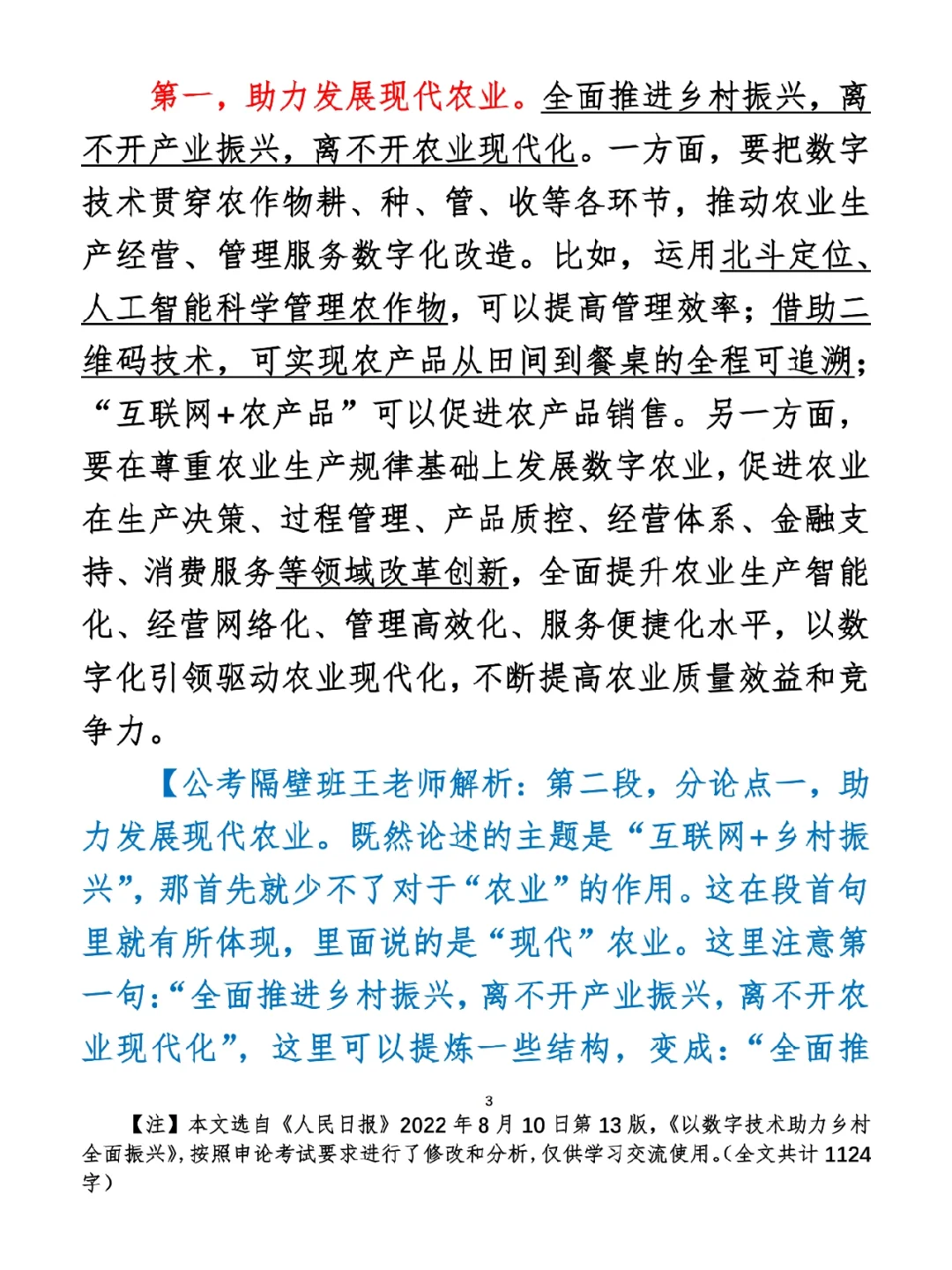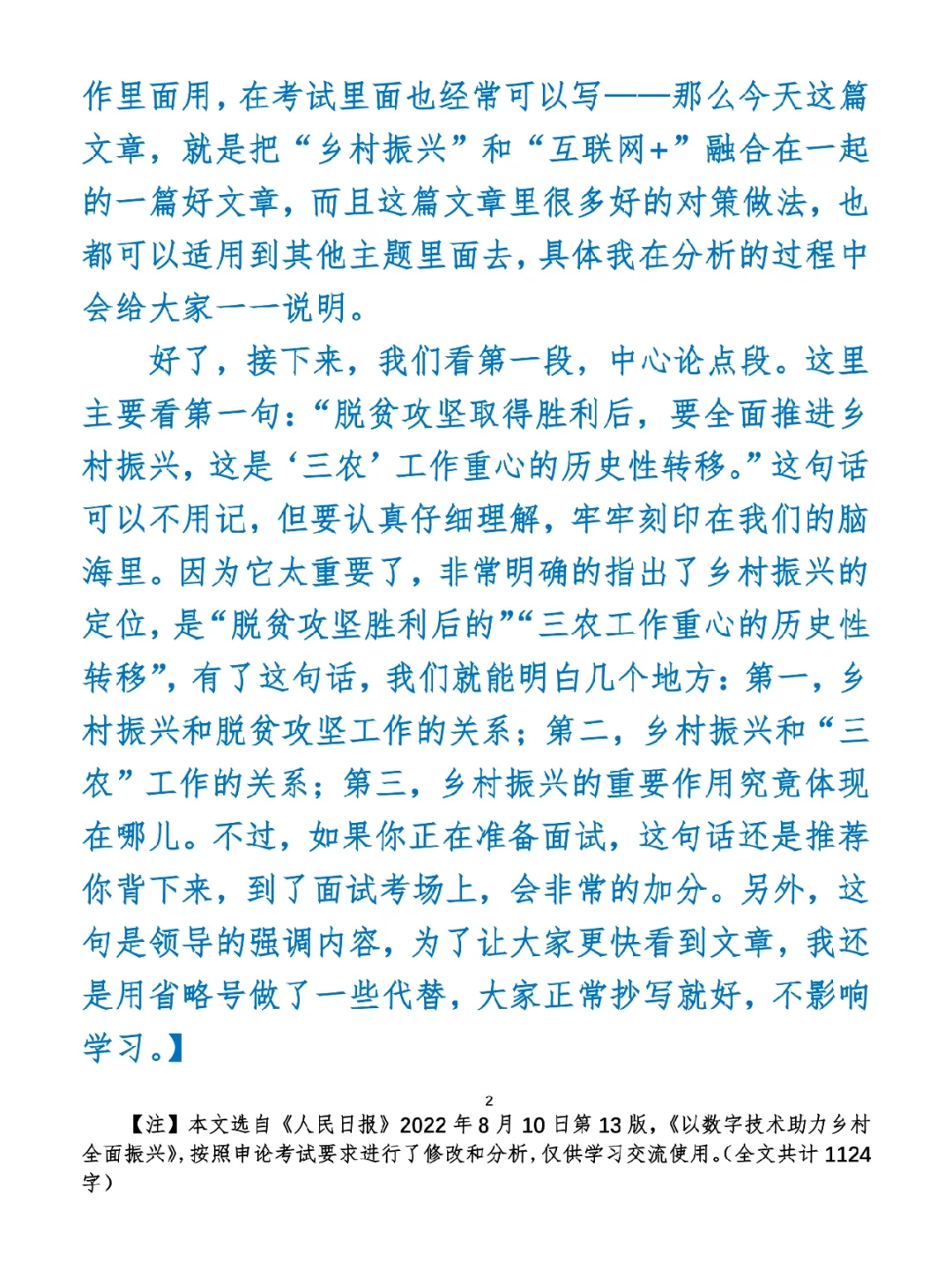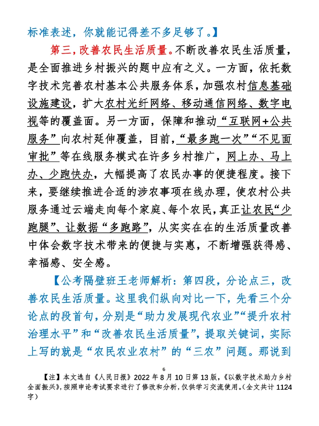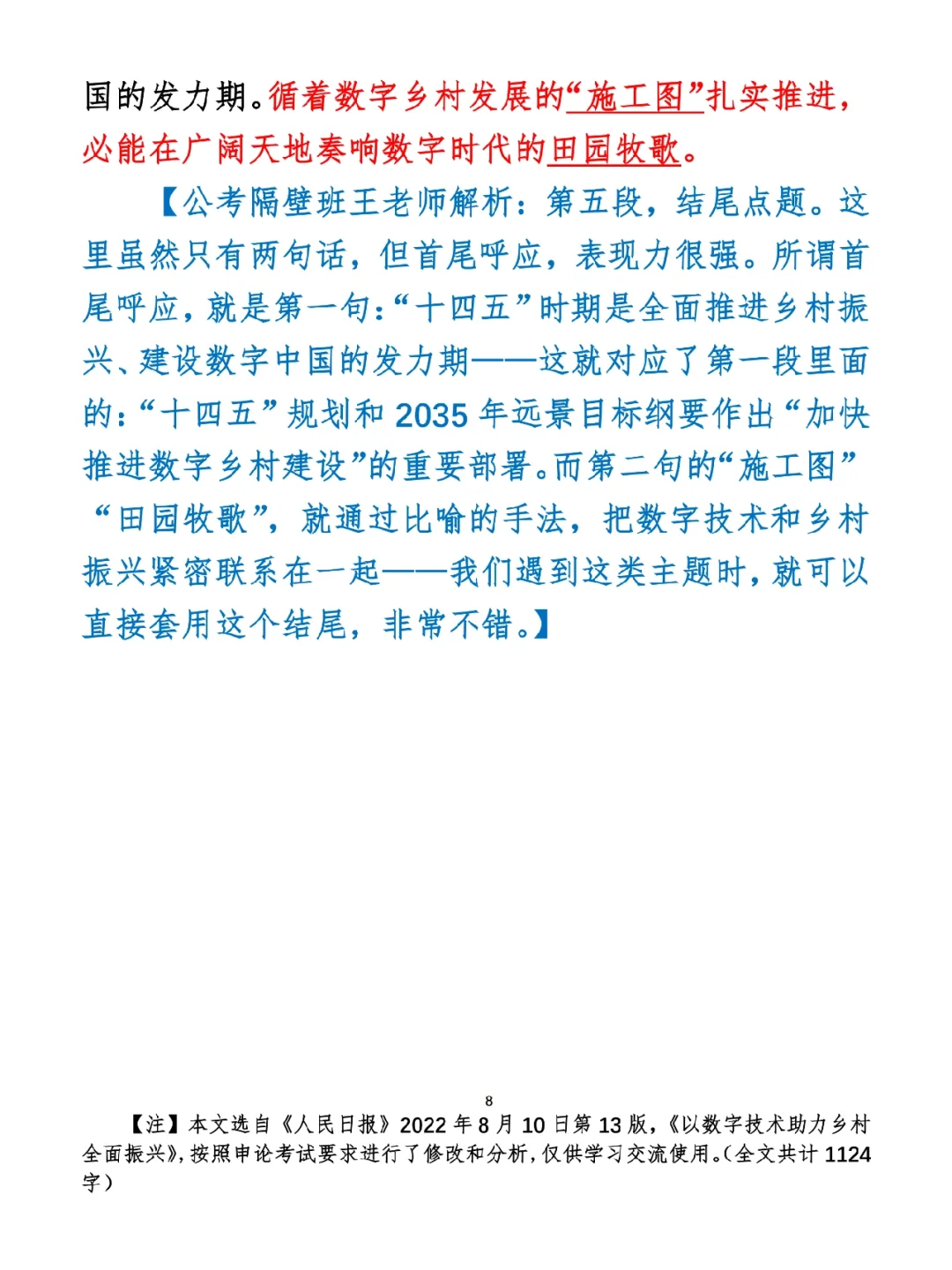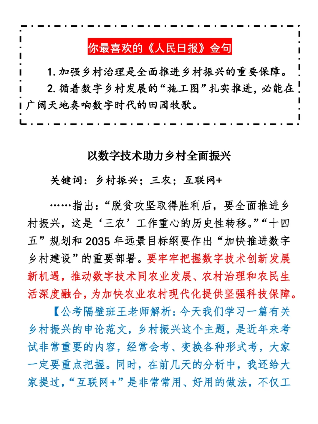 今日打卡作业: 1. 选一句你最喜欢的金句 2. 抄写全文红字+划线部分内容 3. 写完后在留言区打卡 ⭐️ ⭐️ ⭐️ ⭐️ ⭐️ ⭐️ 如何抄写:每天的抄写文章以图片形式发在“公考隔壁班王老师”账号,红色字是重点句和结构句,黑色字是正文,蓝色字是解析,大家抄写时不必抄蓝色字。建议先通读全文(包括蓝色解析部分),做到心中有数再开始抄写,效果会更好。 关于文章:抄写文章来源于人民日报,但每篇文章我都根据申论考试要求进行了修改,主要集中在四个方面:一是重写或修改开头、结尾;二是统一段首句句式结构;三是调整段落字数,使文章结构更均衡;四是简化复杂长难句,使之更具可模仿性。每篇文章修改幅度不同,无论修改多少,都是基于申论考试要求,毫无对人民日报文章品评之意。(此处致敬人民日报) 关于解析:我会在文章每段后面加一段蓝色字的解析,是我自己在抄写时的感悟,篇幅时间有限,不能面面俱到,但求重点突出。如果你有其他感悟,也希望能在评论里分享,我们相互学习、共同进步。 ⭐️ ⭐️ ⭐️ ⭐️ ⭐️ ⭐️ 这里是公考隔壁班王老师独创的“每天半小时・申论80分”抄写团,欢迎加入我们!