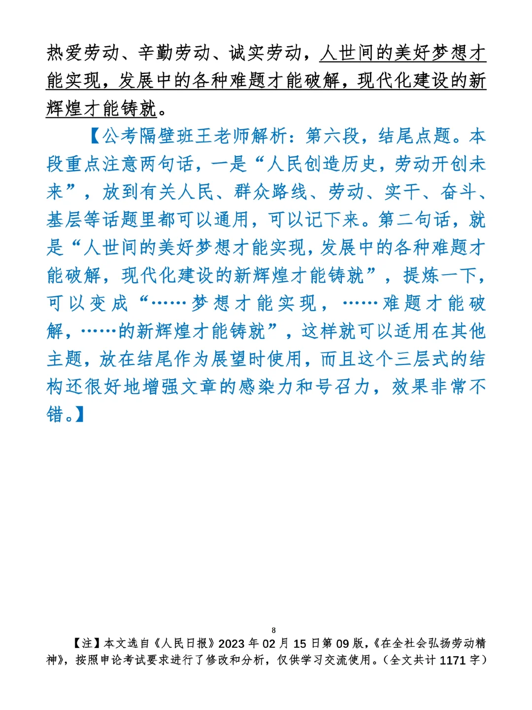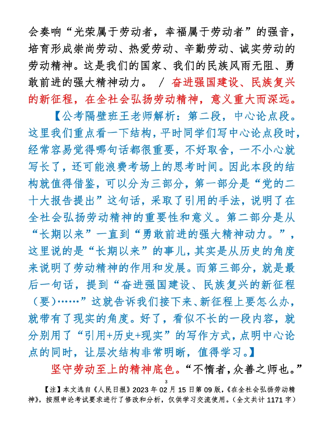 如何抄写:每日抄写文章发在“公考隔壁班王老师”账号,红色字是重点句和结构句,黑色字是正文,蓝色字是解析,大家抄写时不必抄蓝色字。建议先通读全文,做到心中有数再开始抄写,效果会更好。 关于文章:抄写文章来源于人民日报,但每篇文章我都根据申论考试要求进行了修改:一是重写或修改开头、结尾;二是统一段首句句式结构;三是调整段落字数,使文章结构更均衡;四是简化复杂长难句,使之更具可模仿性。每篇文章无论修改多少,都是基于申论考试要求,毫无对人民日报文章品评之意。(此处致敬人民日报)