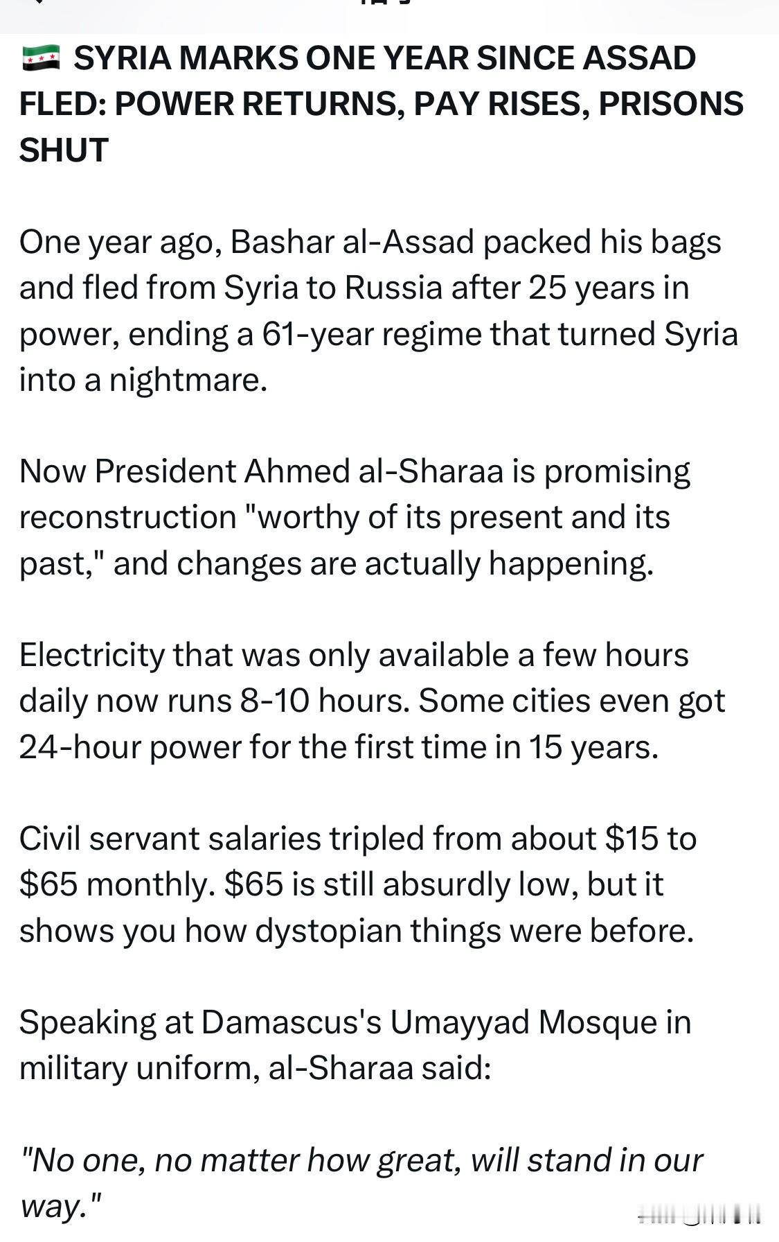 叙利亚迎来阿萨德逃亡一周年:权力回归,工资上涨,监狱关闭 一年前,巴沙尔·阿萨德在执政 25 年后收拾行囊,逃离叙利亚前往俄罗斯,结束了长达 61 年、将叙利亚变成噩梦的政权。 现在,艾哈迈德·沙拉总统承诺进行“与其现在和过去相匹配”的重建,而改变也确实正在发生。 以前每天只能供电几个小时,现在每天供电8-10小时。一些城市甚至15年来首次实现了24小时供电。 公务员的工资从每月约15美元涨到了65美元,翻了三倍。65美元仍然低得离谱,但这足以说明以前的情况有多么糟糕。 身着军装的沙拉在大马士革倭马亚清真寺发表讲话时说: “无论多么伟大的人,都无法阻挡我们。” 新政府关闭了像塞德纳亚监狱这样给叙利亚人民留下“黑暗印记”的臭名昭著的监狱,并正在努力恢复被14年战争摧毁的电网。 当你取得的最大成就是“现在大部分时间灯都亮着”时,这既是一种进步,也是对未来路还很长的提醒。