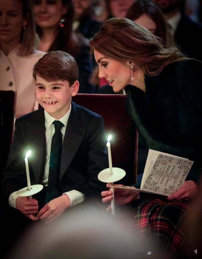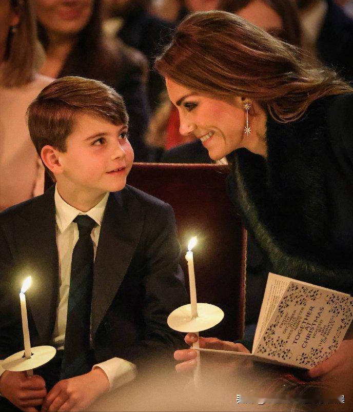 特别喜欢凯特王妃和小儿子路易小王子的这两张照片,画面全是爱! 这两张照片是12月5日,凯特王妃一家五口一同出席圣诞颂歌仪式时,她和小儿子坐在一起时的画面! 从到达威斯敏斯特大教堂后就一直显得很高冷的路易小王子,在面对妈妈凯特王妃的时候终于笑了。 门牙牙缝很大,换牙期还缺了一颗牙,大概也因为如此,所以当晚的路易小王子表现的很深沉。 但是面对最喜欢的妈妈时,路易小王子笑的一脸开心,凯特王妃望着小儿子也是一脸温柔和慈爱。 母子俩对视而笑的画面,实在太有爱了,背影是黄色的烛光,那照片更是氛围感十足,尽显温馨有爱。