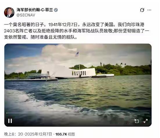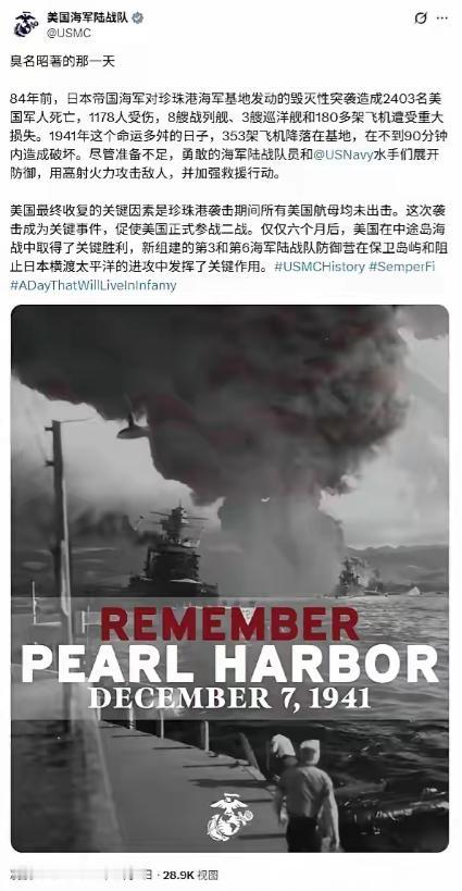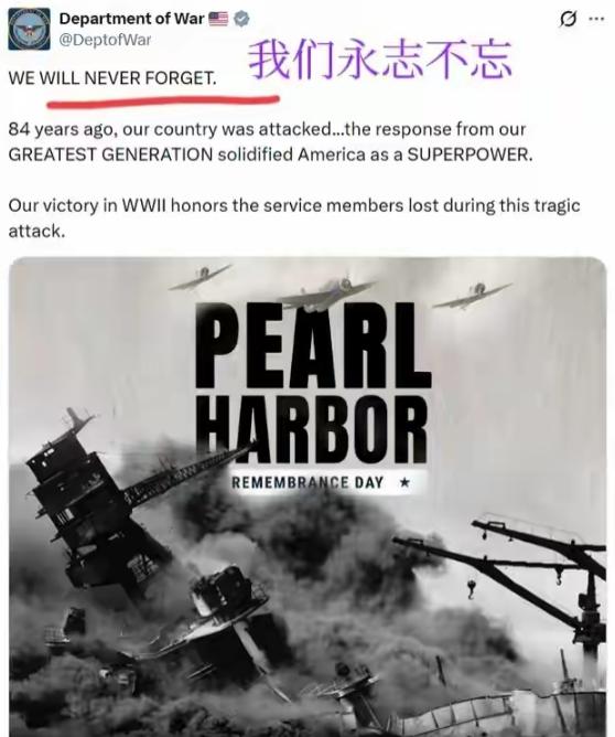 美国对日本的态度一夜之间发生了变化!就是84年前日本偷袭美国珍珠港事件,美国战争部,美国海军,美国陆军,美国海军陆战队,美国白宫,美国内政部,美国海军部长约翰・卡特赖特・费兰,都发表了相关言论。 海军陆战队的话最实在,直接说“84年前日本帝国海军发动毁灭性突袭”,还摆了伤亡数字:2403人死亡,1178人受伤,8艘战列舰被打残,不到90分钟就遭了大殃,连“臭名昭著”都用上了,一点没客气。 战争部就有意思了,喊着“永远不会忘记”,却没提是谁发动的袭击,更尴尬的是纪念海报画错了飞机,把美国自己的TBF轰炸机当成日军战机画上去,网友吐槽“连凶手和自家飞机都分不清”。 白宫和陆军走了中间路线,白宫说“要保持警惕击败威胁”,陆军直接报了伤亡数,都没点日本名字,却都强调“缅怀牺牲者”,这话里的意思,懂的都懂,没明说但账都记着呢。 海军的表态带着点历史厚重感,说“那天把美国推入二战,改变了海军和国家”,提了牺牲者的勇气跨越几代人,没明指凶手,但谁都知道说的是哪件事,比战争部的含糊多了份体面。 有个美国教授看得挺透,直言“要记住始作俑者是日本,得确保他们不再重蹈覆辙”,这话戳中了不少网友的心,评论区里全是补刀“战争部是故意忘的还是真忘了?” 这事得往回捋,1941年偷袭发生后,美国航母刚好没在港里,这才留了翻盘的本钱,六个月后的1942年6月中途岛海战,海军陆战队就打了翻身仗,把日本进攻势头摁了下去。 现在的态度变化不是没原因,3月16日日本刚把国防预算提到GDP的2.5%,创了战后新高,还老想着买先进武器,美国心里能不打鼓?借纪念日敲敲边鼓再合适不过。 更值得琢磨的是日本那边的老底,前首相安倍2014年给偷袭策划者山本五十六献过花,还有高官参拜供奉战犯的神社,这些旧账美国不可能真忘了,只是以前没明说而已。 海军部长费兰在纪念现场没提日本,但说了句“牺牲者的血不能白流,警惕性不能松”,结合日本近期的动作,这话分明是说给日本听的,你说这是不是故意留的话柄? 网友的评论挺有意思,有人说“陆战队是直肠子,战争部是揣着明白装糊涂”,还有人调侃“连飞机都画错,战争部这是怕得罪日本盟友吧”,这玩笑里藏着大家都懂的门道。 往深了说,美国现在需要日本在亚太帮忙,不能把关系搞僵,可历史账又不能真翻篇,这么一来各部门就有了不同说法,有的唱白脸有的唱红脸,把分寸拿捏得死死的。 陆军提“保持警戒守护国家”不是空话,当年珍珠港吃了准备不足的亏,现在日本扩军,美国肯定要防着点,毕竟盟友再铁,也不能忘了人家当年捅过的刀子。 你可能会问,美国这态度变得靠谱吗?其实国与国之间哪有什么永远的朋友,只有永远的利益,纪念日说的话,一半是缅怀先烈,一半是给盟友提个醒,这账算得精着呢。 陆战队敢直接点日本名字,也不是没底气,当年偷袭时美国航母没在港,六个月后就在中途岛打了翻身仗,现在海军实力更不用说,有实力才有说真话的底气。 历史这东西很有意思,84年过去,战场换成了外交和经济,可当年的教训还在那摆着,美国各部门的言论再绕,也绕不开“谁是凶手”这个基本事实,你说对不对? 真正的纪念从不是喊口号,而是记住教训不让悲剧重演。美国这波态度变化,不管是真心缅怀还是战略考量,至少让更多人想起了那段历史,这就比模糊过去强得多。 国与国之间的交情,从来不是靠藏着掖着维系的。不管是过去的珍珠港事情,还是现在的台海事件,日本要是真懂道理,就该正视当年的事,而不是遮遮掩掩。 信息来源: 环球时报——2025-12-08美国国防部:我们不会忘记!