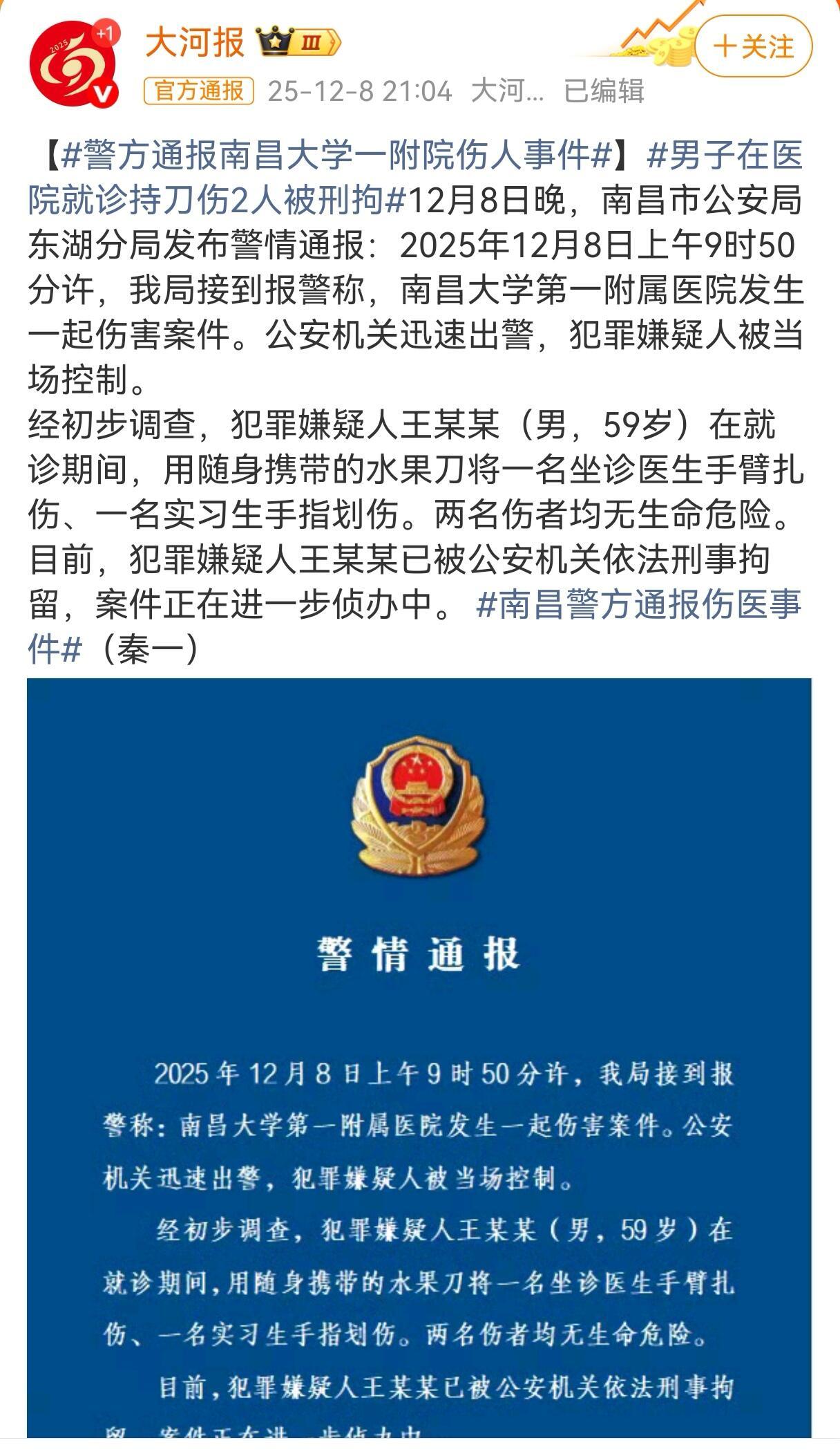今天早上南昌大学一附院出了个事,一个59岁的男的看病的时候,突然拿水果刀扎伤了坐诊医生手臂,还把旁边一个实习生手指划伤了。人当场就被警察按住了,还好俩人伤得都不重,就是手臂扎伤和手指划伤,没网上传的那么吓人。 现在这人已经被刑拘了,具体为啥动手警察还在查。网上说什么“手术没做好报复”“打官司输了”这些,都还没证实,咱们先别乱猜。 但这事真不是个例。现在医院里医生护士挨骂、被推搡的事儿太多了,医院好像成了个“出气筒”。很多医生都说,整天提心吊胆的,这还怎么好好给人看病? 我觉得是该想想办法了。一方面,对于这种暴力伤医的,确实应该从严处理,就像对待袭警一样,让那些人知道动手的代价有多大。另一方面,医患之间有矛盾也得有个靠谱的解决渠道,不能光让患者憋着火,也不能总让医生背锅。医院安检、保安这些是不是也该加强点儿? 医生治病救人已经够累了,还得天天防着挨打挨骂,这谁受得了?咱们谁还没个生病的时候,这么闹下去,最后吃亏的还是咱们老百姓自己。