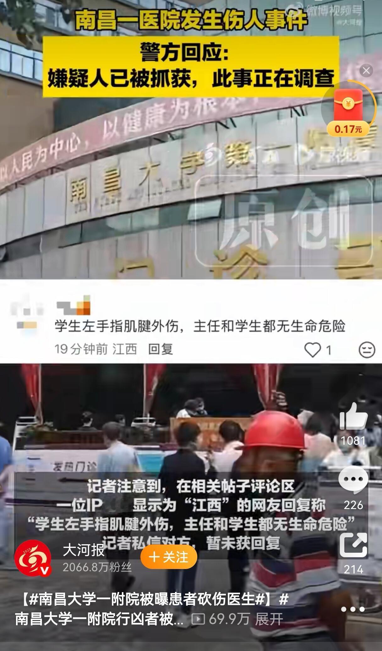 今天早上南昌大学一附院出了个事,一个59岁的男的看病的时候,突然拿水果刀扎伤了坐