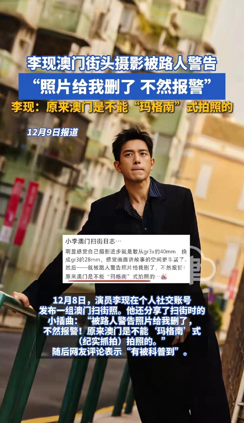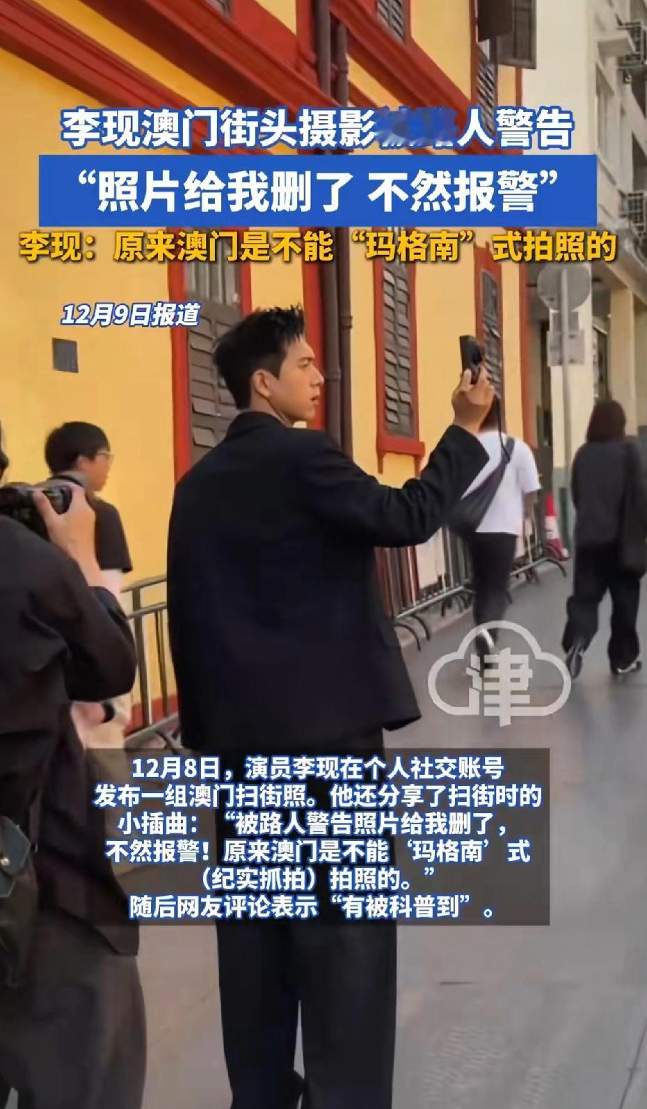 李现澳门街头拍摄被路人警告,“照片给我删了不然就报警” 12月8日他在个人账号发澳门扫街照,还分享了被路人警告的小插曲,原来澳门不能“玛格南”式抓拍。 看来李现在澳门的识别度不高,要是来内地拍摄早就被粉丝围堵了,即使有人报警也是因为粉丝太疯狂了。 真是被科普到了,地方规定不同在大陆没有禁止抓拍这一项,欢迎李现来郑州老城区拍摄。 这里干净又卫生,烟火气十足,来这里拍摄,绝对不会有人报警抓你。 当时他一身简约穿搭,专注拍街头烟火气,结果拍老建筑时被路人要求删照片,不然报警。后来才知道是当地有规定,未经许可拍可能侵权。