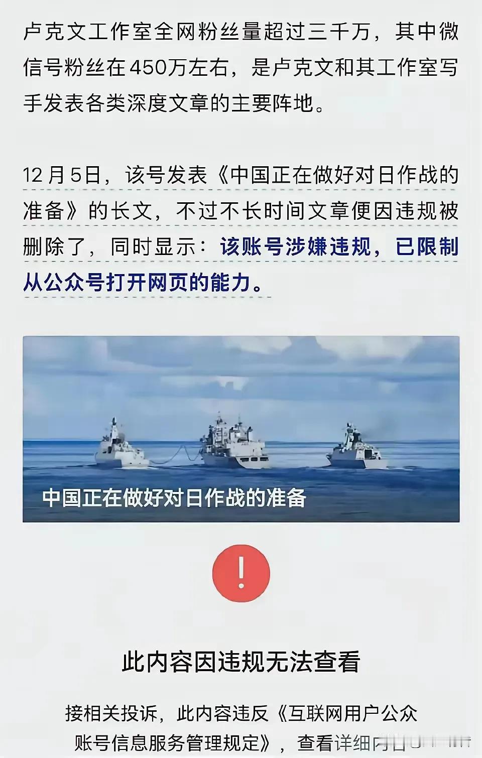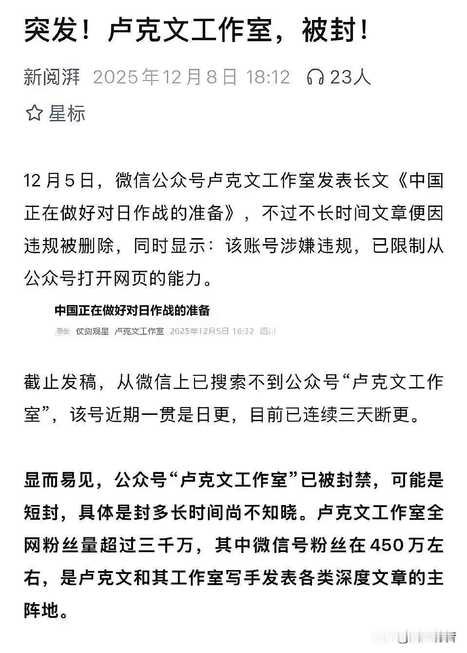 卢克文是妥妥的网络大V,但突然之间,他的工作室就被封了。 为什么被封?根据他12月5日发表的一篇文章被删除可以判断,他的问题应该是在重大国际热点问题上凭借主观臆断进行分析评判,缺乏事实根据,踩了红线,被处罚是很正常的事情,我也表示支持,但一些自媒体人的评论却不敢让人苟同。 例如,一个小有名气的自媒体博主就作出以下评论:一直就不能理解,为什么这么缺乏国际关系常识的人,居然能这么火。这老兄几年前支持本拉登被封后居然又复活了,但缺乏常识的人,犯错误是迟早的。可怕的是,像卢克文这样迎合网民口味的网络大咖,有着非常广泛的社会基础,拥趸者众,许多网民如果任由其胡咧咧,在社会上将会起着巨大的负面作用。 我认为,这样的评论带有浓重的个人情绪,因为他不是就事论事,而是将矛头对准卢克文的个人能力上,这就未免太过偏颇了。卢克文以往的很多作品还是有独到之处的,是比较有水平的,广大网友也不是没有任何分析判断能力,否则他也不会以一个中专生的学历一跃而成全网粉丝量超过三千万的知名的网络大V。 人非圣贤孰能无过?卢克文在敏感问题上逾越红线,得到处罚,不代表他以往所有的观点都是错误的,不代表他个人没有能力。如果以一时错误否定他的一切,甚至包括他的粉丝,那只能说明你的格局太小了。 不过,在此也要提醒自媒体创作者,发布文章时一定要严格遵守国家法律法规要求,不能触碰踩踏红线,否则,不管你有多少粉丝,有多大影响力,都会受到惩处。