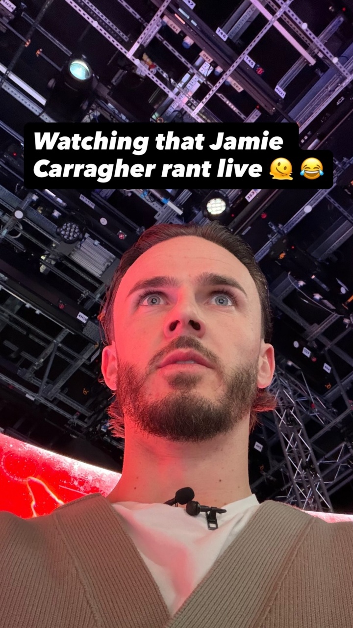当晚与卡拉格一起参加节目的还有正在养伤的热刺中场麦迪逊,他在社媒晒出了一张自己一脸震惊的自拍,并配文:“现场观看卡拉格开炮”