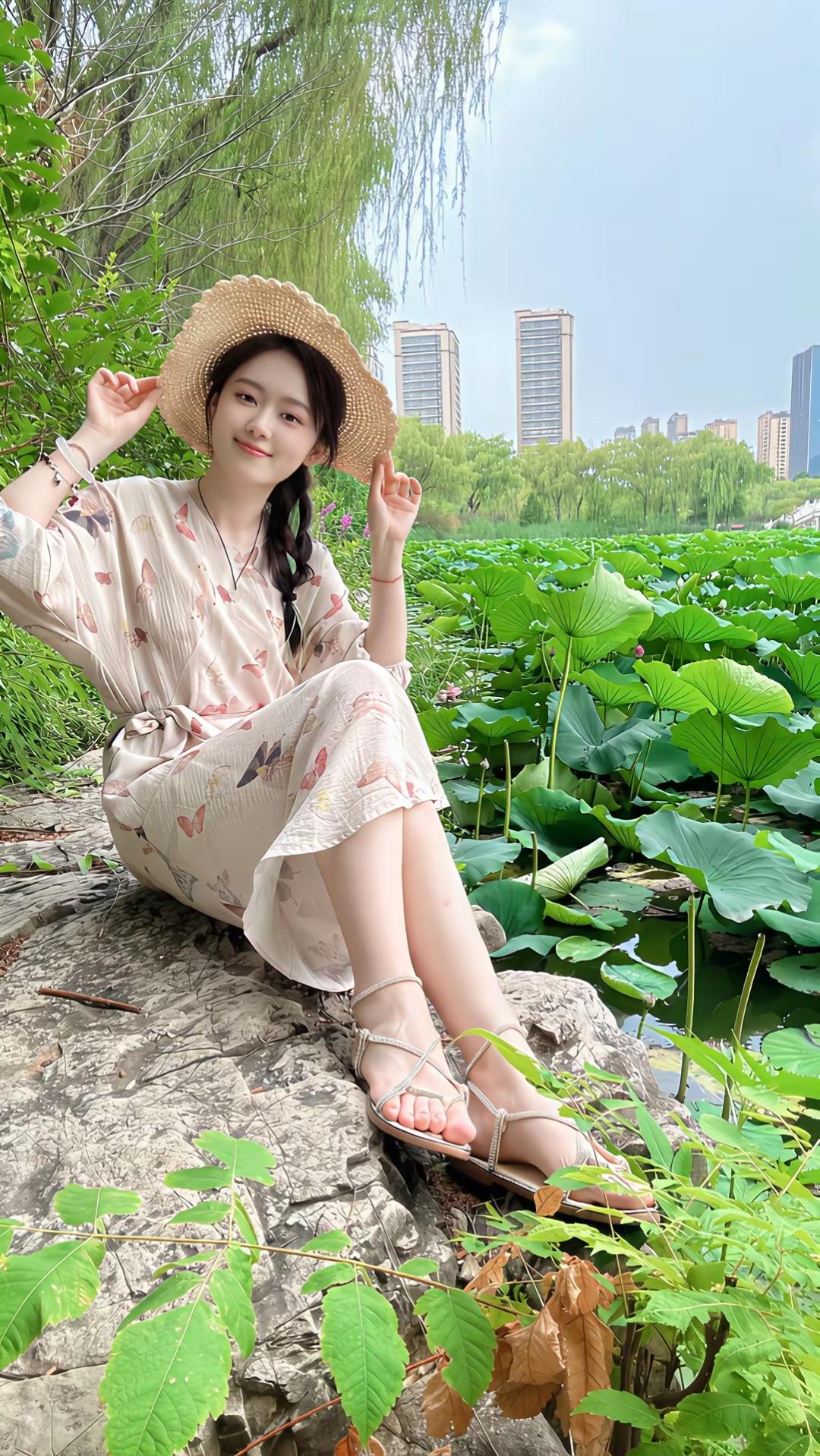 夏日荷塘边,少女与自然共舞