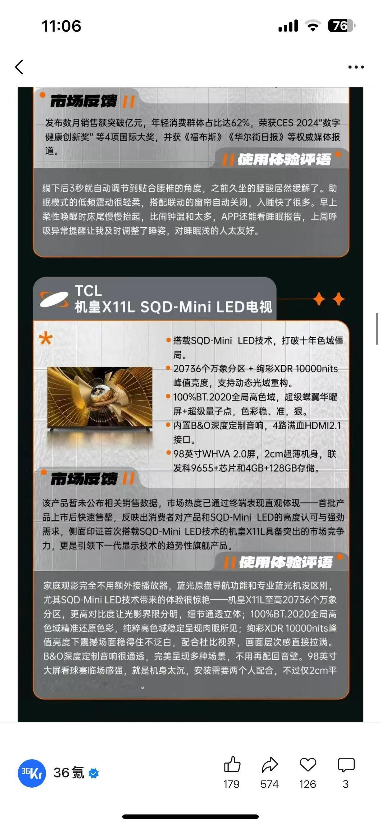 选电视看懂数字迷雾,才能一步到位 最近想换电视的朋友,你们都在关注什么配置?有些人肯定是看重色域,其实高色域,真的不等于高画质! 为什么这么说?因为真正决定你眼前画面是否通透、立体、有电影感的,核心是 对比度”。简单说,就是电视要能黑得下去,亮得起来。暗部深邃,亮部耀眼,画面才有层次和生命力。而色域,更多是负责色彩的丰富程度。 其实当前高端电视市场的两个技术路线,一个是RGB-Mini LED,另一个则是基于量子点技术更新的 SQD-Mini LED。 先说结论,从底层技术来说,SQD可以实现降维打击。 先说你们关注的色域值,同样是宣传“高色域”,底层技术却天差地别 1. 色彩稳定性才是关键, 其实RGB-Mini LED 的问题在于“偏科”。它用红、绿、蓝三色灯珠发光,在显示大片纯色时表现惊艳。但一旦播放色彩复杂的电影或游戏,需要三色混光时,色域值就会明显下降,甚至可能出现串色、偏色。这就像一名只有单科能考满分的学生,在总分上表现并不突出。这种一般是游戏爱好者更喜欢。 而SQD-Mini LED 则采用了不同的技术思路。它用一道超纯净的蓝光去激发超级量子点材料的特质,可以发出纯净的红、绿、蓝光,这种方式从光源上就保证了颜色的纯正和稳定,所以是完全能做到 100% BT.2020 全局高色域,而且最重要的是,全场景都能稳定发挥,单色还是复杂画面,色彩始终饱满、准确,是真正的“学霸”。 2. 控光与对比度,不堆数量主攻高校控光 决定对比度的关键是背光分区。SQD-Mini LED采用的是最高效的万象分区控光,从底层发光到成像,再到屏幕显示都做全链路的提升,实现更精细的控光。比如TCL搭载该技术的旗舰机X11L,分区数量达到了惊人的20000+级,画质效果可以达到天花板级别,还是极景无黑边的设计,真正的第四代全面屏,特别大气。 而可以达到峰值亮度可达10000nits亮度,和超高对比度,结合全局高色域,画面会更加通透感立体。 由于技术方面都叠加升级更优,SQD-Mini LED电视可以做得非常薄。X11L的机身厚度仅约2厘米,可以像壁画一样完美贴墙,可以完美的贴合现在简约的装修风格,无论挂装或者坐装,落地放都很好看。 双十一TCL就是以技术征服了不少人,实现了全渠道双冠王。据奥维云网数据显示,25年前三季度的销量已经是全球第二,也证明了在国内外用户认可度很高。 所以,选购高端电视,别再只盯着那些数字标签了,对比度高体验好才是王道。装修如何营造高级感 电视墙如何装修最流行 小客厅装修,怎样显大又高级? 万元级旗舰电视如何选? 电视尺寸和画质哪个更重要? 电视 画质 好用