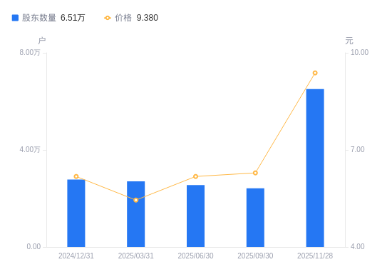 日期A股户数(户)流通A股户均持股数(股)户均持股市值(万元)2025-11-28650855285.344.962025-09-302418814221.768.952025-06-302549713491.638.342025-03-312703812722.276.932024-12-312778512380.237.652024-09-303045911293.466.632024-06-303107311070.315.522024-03-312803912268.187.242023-12-312827312166.659.722023-09-302986211519.248.96