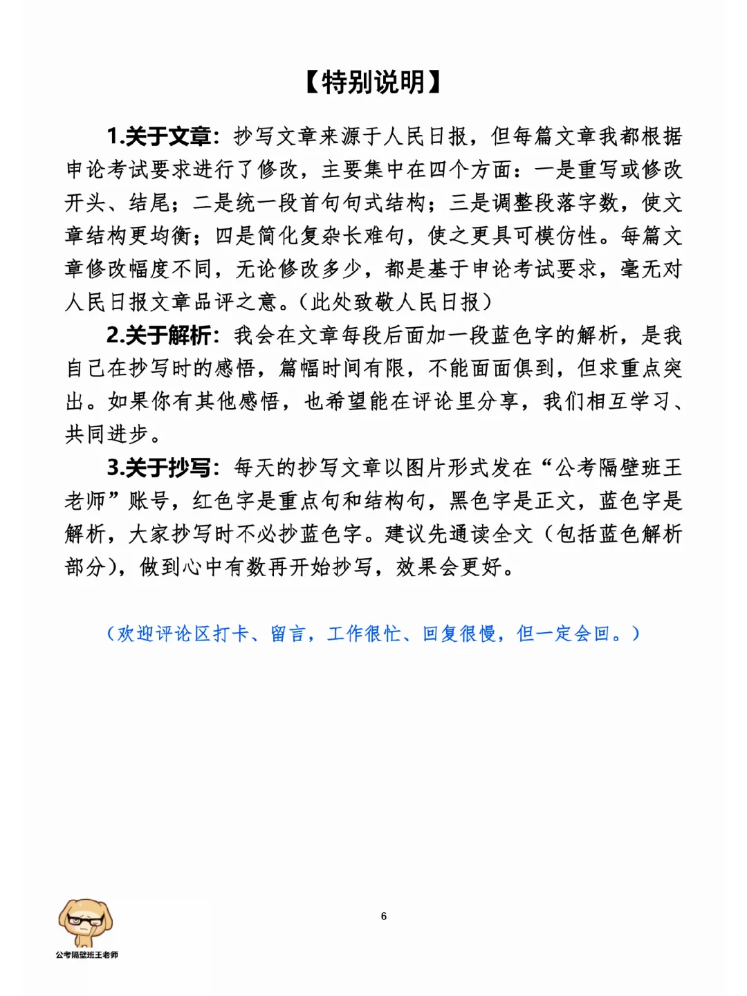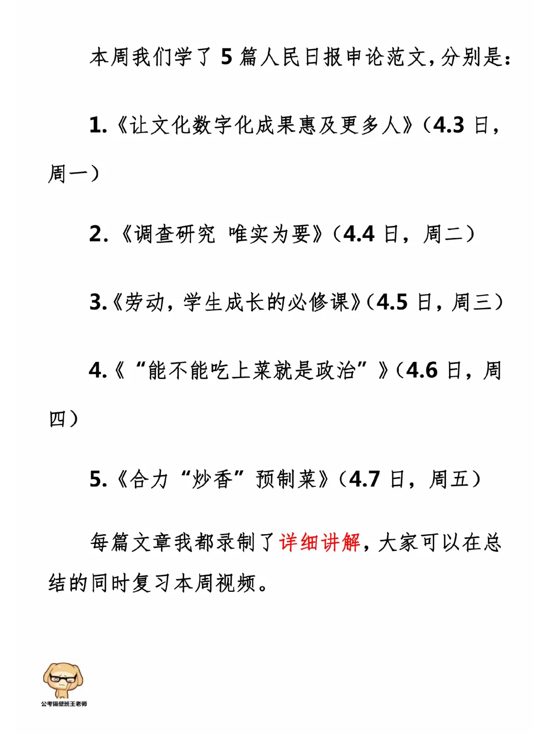 今天我们积累申论素材、必背金句和重点知识。它们来自于一周以来,我们学习的5篇人民日报申论范文,分别是: 1.《让文化数字化成果惠及更多人》(4.3日,周一) 2.《调查研究 唯实为要》(4.4日,周二) 3.《劳动,学生成长的必修课》(4.5日,周三) 4.《“能不能吃上菜就是政治”》(4.6日,周四) 5.《合力“炒香”预制菜》(4.7日,周五) 今天,我们就总结学习一下里面的“万能金句”。 每篇文章的详细讲解请回顾本周视频。 ⭐ ⭐ ⭐ ⭐ ⭐ ⭐ 这里是公考隔壁班王老师独创的“每天半小时・申论80分”抄写团,欢迎加入我们!