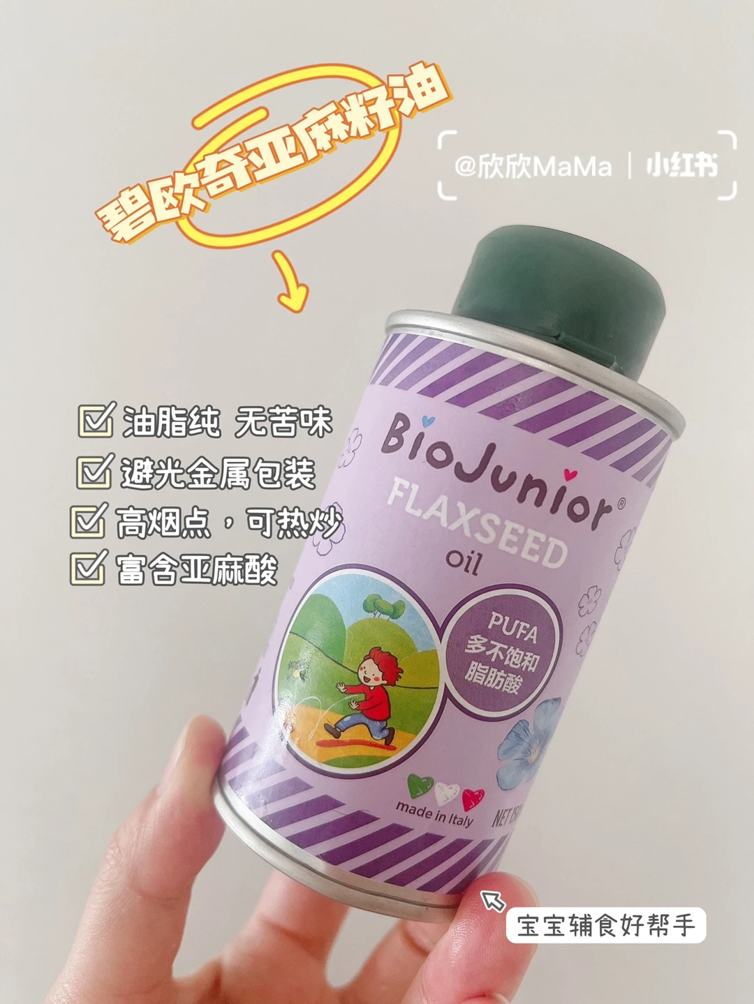 我用到的辅食油是碧欧奇亚麻籽油,它家亚麻籽油油脂纯,没有苦味,宝宝很容易接受!采用的是金属包装,能百分百完美避光,能更好的保存!它是国家一级亚麻籽油,亚麻酸含量55%是牛油果油的90倍 ,烟点是231度,可以凉拌也可以热炒,辅食必备哦!每次我做蒸糕、热炒我都用到它,用的放心!