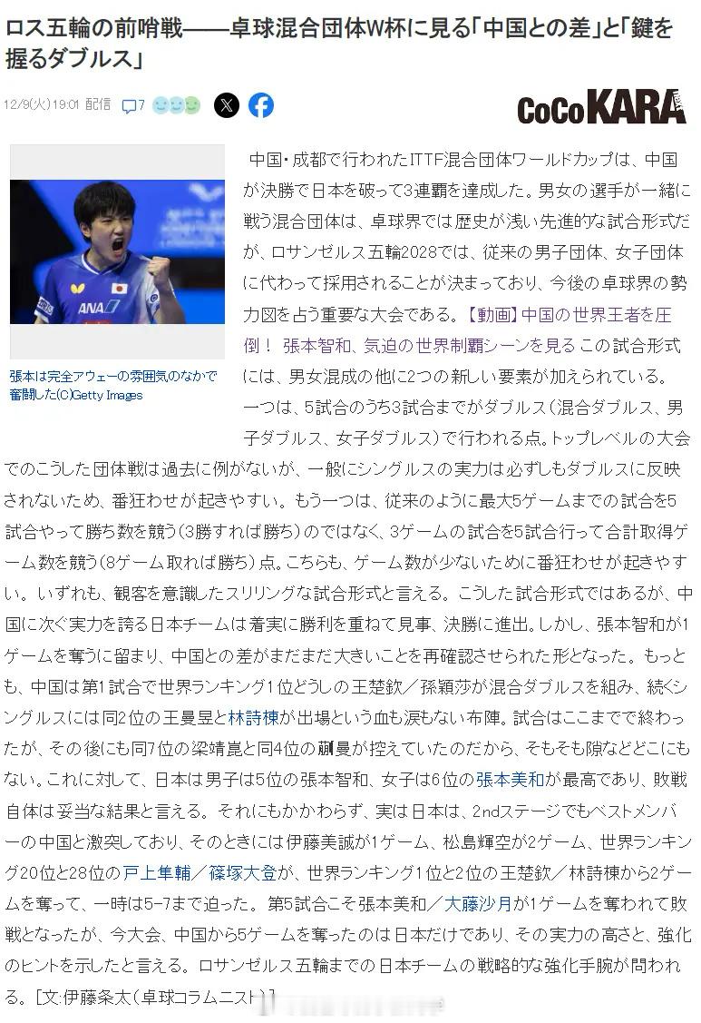日乒专家:从混团看出与中国队差距仍巨大 日本队战力强化遭质疑2025年混合团体世界杯,日本队创造队史纪录拿到亚军,在2023年他们是季军,在2024年他们是第五名,赛后不少日本媒体盛赞日乒创造队史纪录,为张本智和、松岛辉空、户上隼辅、篠塚大登、张本美和、伊藤美诚、早田希娜、大藤沙月等人唱赞歌。北京时间12月9日晚,日乒专家伊藤条太在接受日本媒体《CoCoKARA》采访时明确表态:作为洛杉矶奥运会混团的前哨站,成都混团世界杯足以看出日本队与中国队的差距还非常之大,日本队的战力提升饱受质疑。伊藤条太在采访中说道:2028年洛杉矶奥运会首次引入了混合团体的形式取代了男子团体与女子团体,所以2025年混团世界杯就是洛奥的前哨站,这是奥运会史无前例的变革,日本在今年首次冲入决赛,但15盘取8分的比赛日本队只有张本智和拿到1分,可以说日本队在决赛中是一边倒的态势惨败中国队。日本队男单世界第五的张本智和在林诗栋手中拿到1分,日本女单世界第六的张本美和在对阵王曼昱选手时0-3落败,决赛战中国队不费吹灰之力就击败了日本队。尽管在第二阶段日本队在中国队手中拿到了5分,可决赛中国队动真格后日本队就明显挡不住了。这种巨大的变革出台后,日乒需要在混双、男双、女双项目上都进行调整,培养出最适合在洛杉矶奥运会出战的组合,只有这样才可能跟王者中国队一较高下,目前日本队的战力提升非常有限,这也是日本球迷们一直诟病的地方。