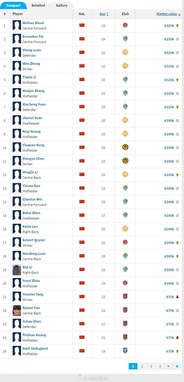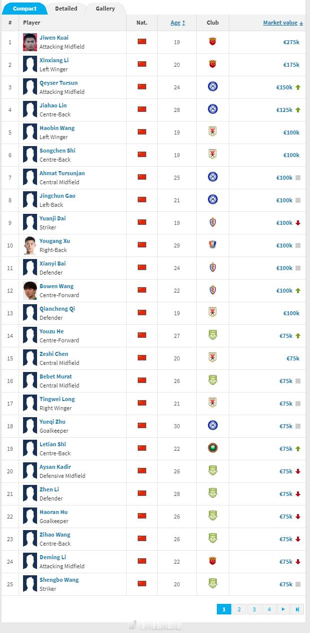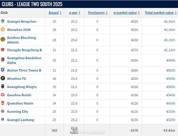 德国转会市场网(TransferMarkt.de)2025年终中乙球员身价例行更