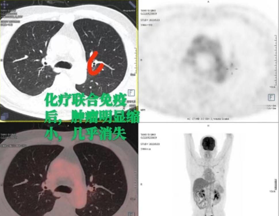 以前,如果一个肺癌患者到了晚期,又查不出对应的基因突变,那治疗选择往往只剩下化疗。 但现在不一样了,哪怕没有靶向药可用,我们还可以采用“化疗+免疫治疗”这种组合方案,很多时候能实现“1+1>2”的效果。 根据我积累的数据来看,即使是病情较晚、肿瘤负荷大的患者,也有约三分之一的人,通过这种联合治疗之后,肿瘤能够完全消失,并且获得长期的生存机会。 我们遇到过不少这样的病例。比如有位54岁的患者,得的是中央型肺鳞癌,肿瘤长到5公分,紧紧包裹住心脏、肺和肺动脉,既没有靶向药可用,手术也根本做不了。 后来,我们给他做了三次“化疗联合免疫治疗”。复查时发现,肿瘤竟然差不多全都消退了。之后,我们又为他做了接近四个小时的微创手术,切除了残余的病灶。 像这种一开始肿瘤很大、侵犯重要结构、甚至已经转移的患者,放在过去,通常被认为失去手术机会,生存期也非常有限。 但现在,通过免疫治疗联合化疗,很多病人肿瘤明显缩小,重新获得了手术切除的机会。术后再配合定期随访,不少人能够实现长期生存,这在以前是难以想象的。[玫瑰][作揖]
