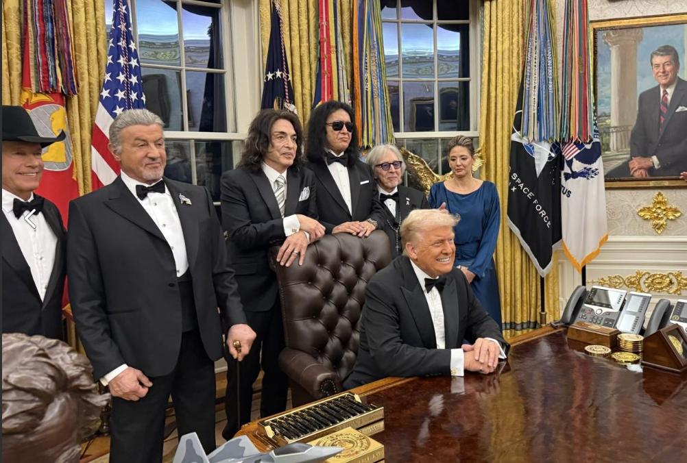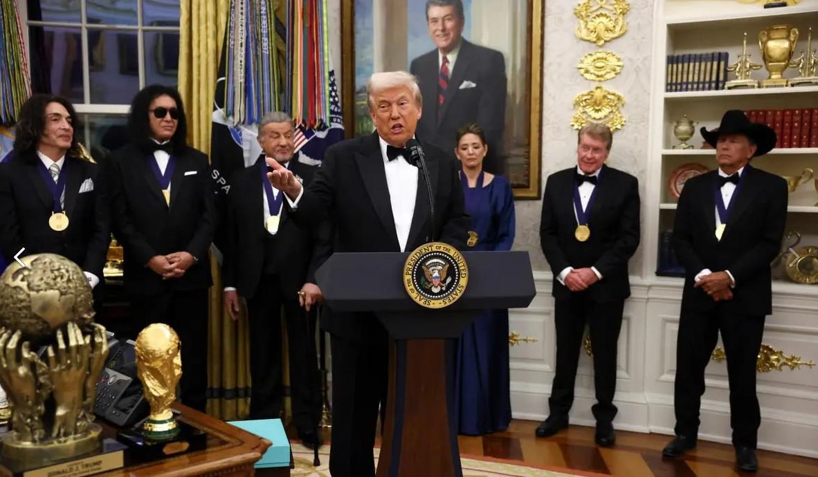 特朗普日前在白宫向肯尼迪中心授予了一批知名艺术家的奖章,其中包括演员西尔维斯特·史泰龙。 颁奖典礼上,特朗普抱怨道,在他看来,现代电影界几乎已无传奇巨星。他在向史泰龙颁奖时说:"我的朋友是一位杰出人物,是真正伟大的电影明星之一。这样的明星寥寥无几。但以前,他们要多得多。" 不难看出,特朗普也是个追星的老影迷。