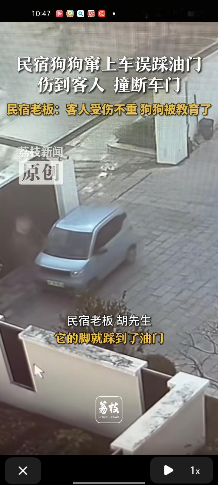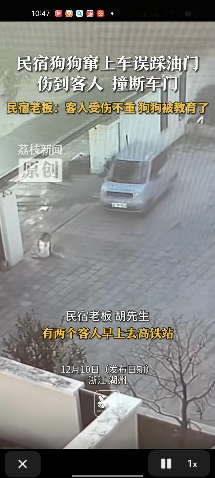 12月9日,湖州市安吉县。两位客人来住民宿,大早上要去高铁站,管家准备开上小电车送两女子出去打车,正准备走的时候狗子窜上车。管家试图拉狗子下车,结果它跑到副驾驶位,脚碰到了倒车档,撞倒了客人,车门报废了,好在客人没事。事后,民宿老板给肇事狗打了几巴掌