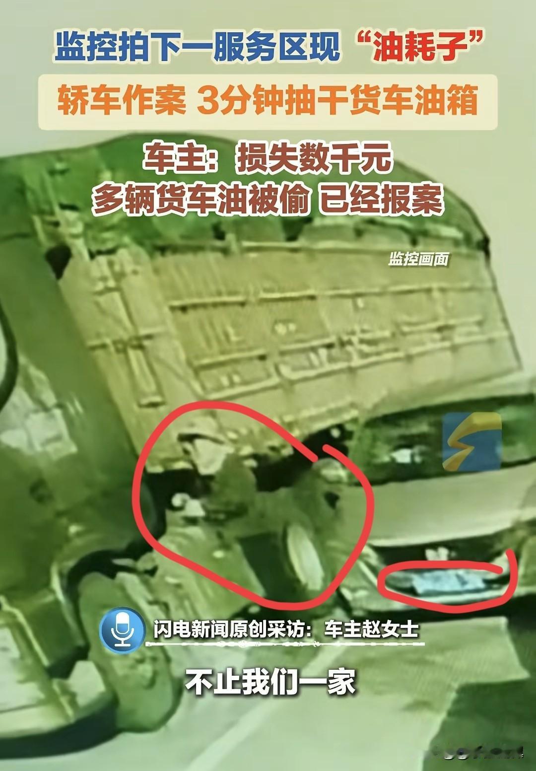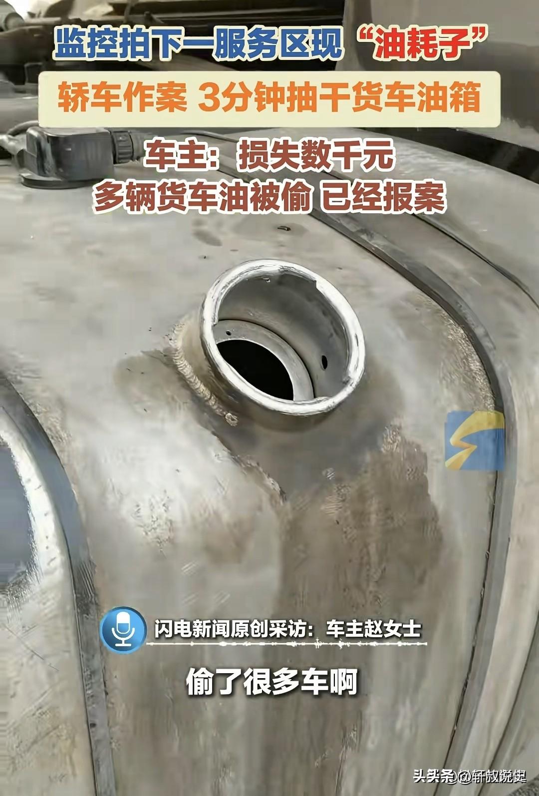 货车服务区被偷油续!作案监控曝光,3分钟就抽干,司机损失惨重。[嘘] 常言道:这年头还有油耗子在作案,不是穷疯了就是老手,撑死胆大的饿死胆小的,监控的普及就是他们的天敌,一举一动无所遁形。 湖南郴州境内的厦蓉高速桂阳服务区,近期发生了多起货车柴油被盗事件,相关监控视频在网络流传,引发了货运司机群体的关注。 监控画面显示,盗窃者通常在深夜或清晨驾驶普通轿车进入服务区,停靠在货车旁,随后车上人员快速下车,使用工具破坏货车油箱盖,插入抽油管连接到自带容器,整个过程动作熟练,耗时很短,作案车辆往往遮挡号牌,人员也佩戴口罩帽子遮盖面容。 据报道有多位货车司机在此遭遇盗窃,单次损失可达数千元,燃油是长途运输的主要成本之一,这类盗窃给司机带来直接经济损失,也影响了行车安排和运营安全。 目前已有受害司机向公安机关报案,由于涉案金额较大,此类案件通常符合刑事立案标准,公安机关正在根据监控录像等线索开展调查工作。 “三分钟,一箱油就没了!监控底下都这么狂?”这两天,湖南郴州桂阳服务区货车柴油被盗的监控视频,看得人既气愤又心疼,评论区里都炸开了锅,讨论得非常激烈。 “太猖狂了!大白天都敢这么干,简直无法无天。” “看到司机第二天醒来一脸懵的样子,真的心疼,跑长途本来就不容易,睡一觉几千块油钱没了,这一趟等于白干。” “戴帽子口罩、遮挡车牌,一看就是老手,反侦查意识很强。” “他们掐准了司机深度疲劳、必须睡觉的时间窗口,动作又快,等司机发现早就跑了。” “在一个服务区频繁得手,说明他们对环境非常熟悉,甚至可能摸清了监控盲区或巡逻规律,这需要警方高度重视,是不是有内应或者长期踩点?” “尽量把车停在有灯光、靠近摄像头的地方,最好能和其他车凑一起,互相有个照应。” “加装一个结实的油箱锁是最基本的,虽然防不了暴力破解,但能多耽误他们一会儿,增加风险。” “有些老司机会在油箱附近装个廉价的防盗报警器,一有震动就响,至少能惊醒自己或附近的人。” “道高一尺魔高一丈,我们装的锁,他们总有更专业的工具,最根本的还是得靠抓,靠管。” “服务区作为经营和管理方,有没有尽到基本的安保责任?夜间巡逻频次够不够?监控是只管录,还是有人实时看?” “光有摄像头不够,得配上有效的响应机制,偷油两三分钟,等保安反应过来,人早跑了。” “这种案件案值容易达到立案标准,必须全力侦破,形成威慑,不能因为案子小就忽视,对司机来说都是血汗钱。” “建议建立黑名单,对使用套牌、假牌车辆作案的行为,要从车辆来源、销赃渠道等多方面打击,揪出幕后团伙。” 那么你对这件事怎么看?你觉得防范“油耗子”,是司机自己多加防范更重要,还是服务区、管理部门加强巡逻打击更关键?如果你有相关经验或建议,欢迎在评论区分享出来,给奔波的卡友们支支招。 信息来源:闪电新闻